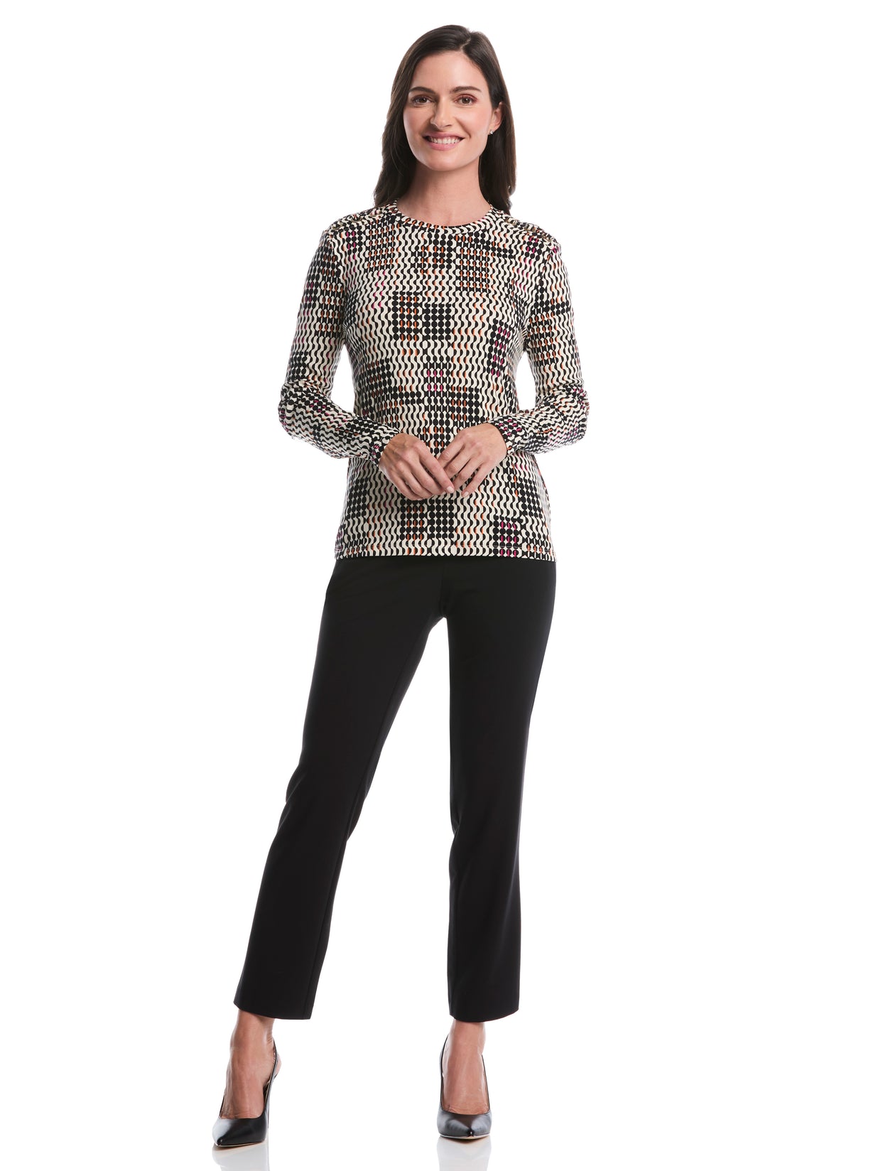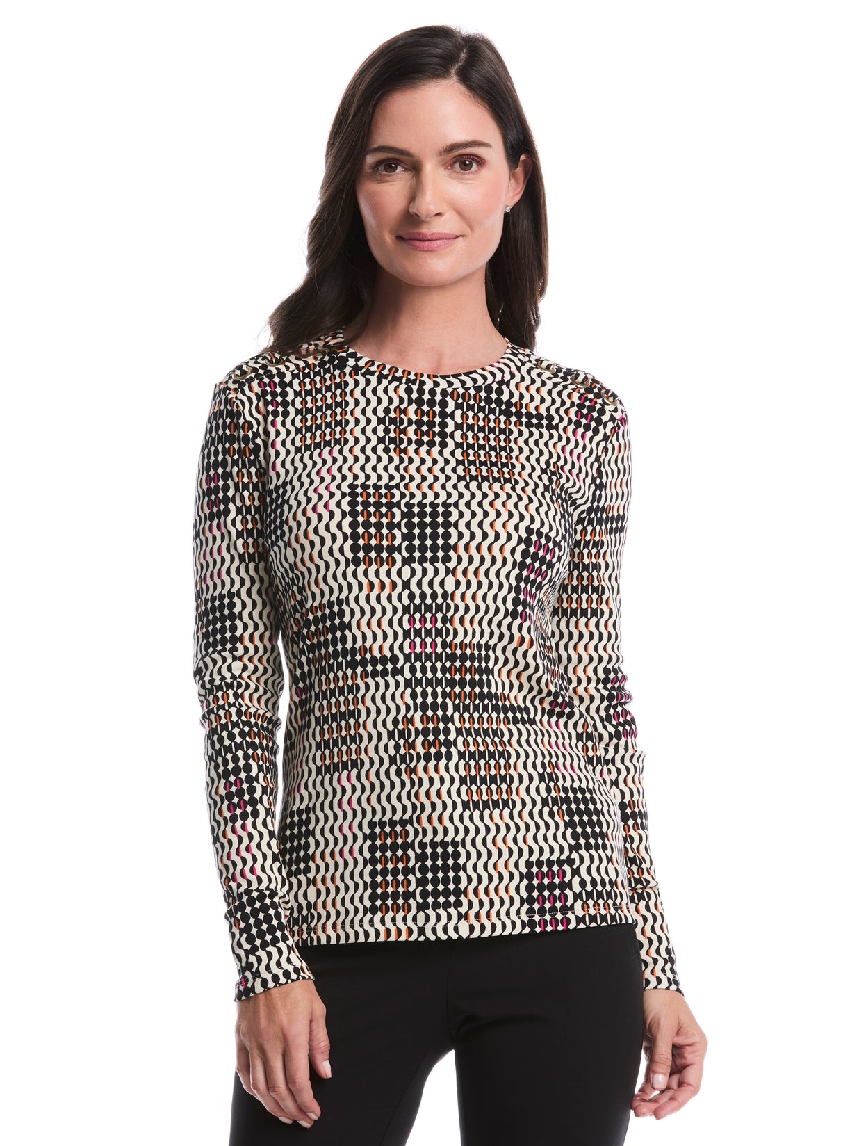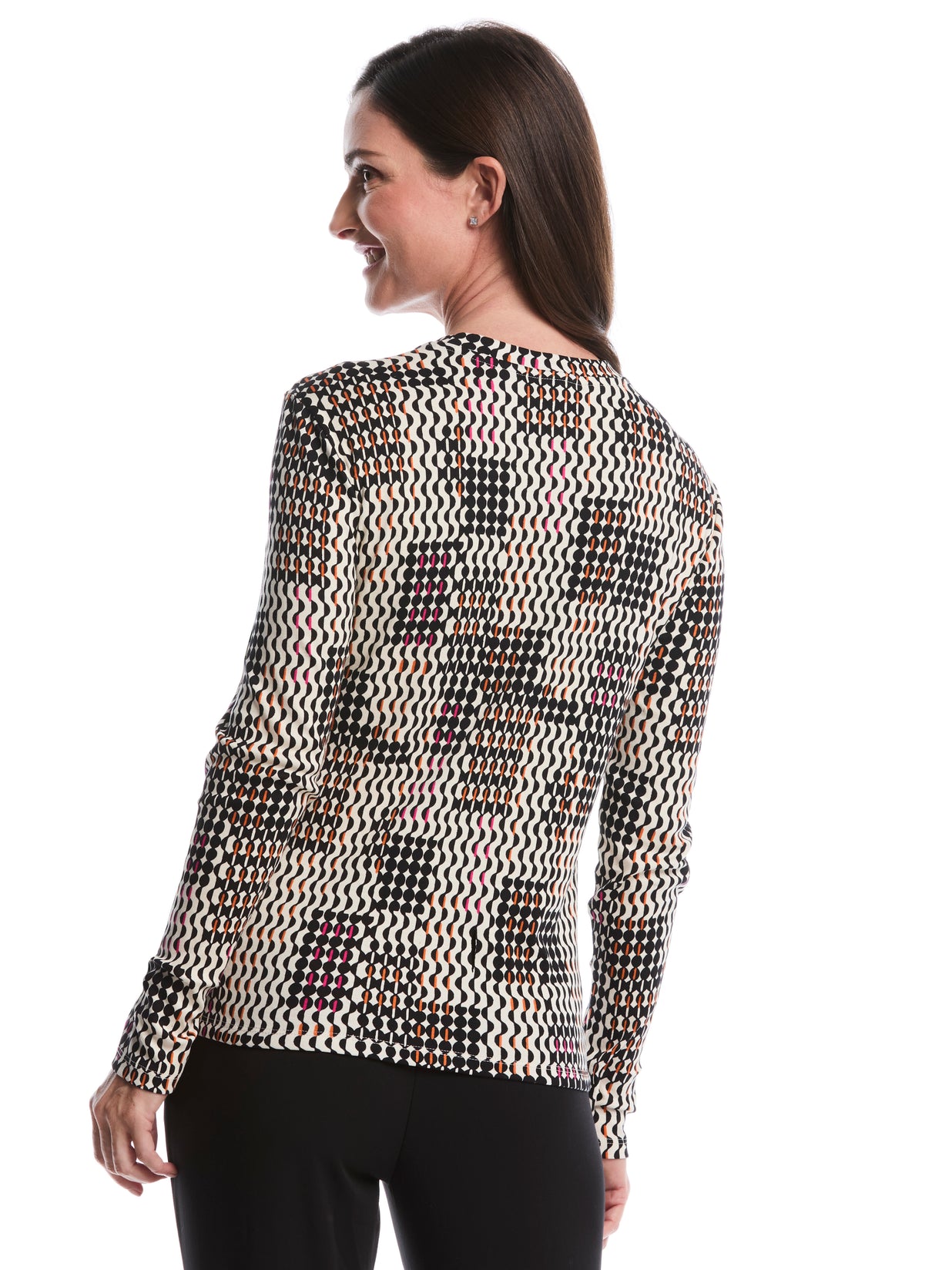 This Rafaella women's long sleeve top features modern detailing to give your everyday look added flair. The laced detailing includes gold-toned grommets while the all-over geometric pattern makes a statement. This versatile and stylish blouse can be dressed down with jeans on days off or worn with dress pants for a polished look during the week.