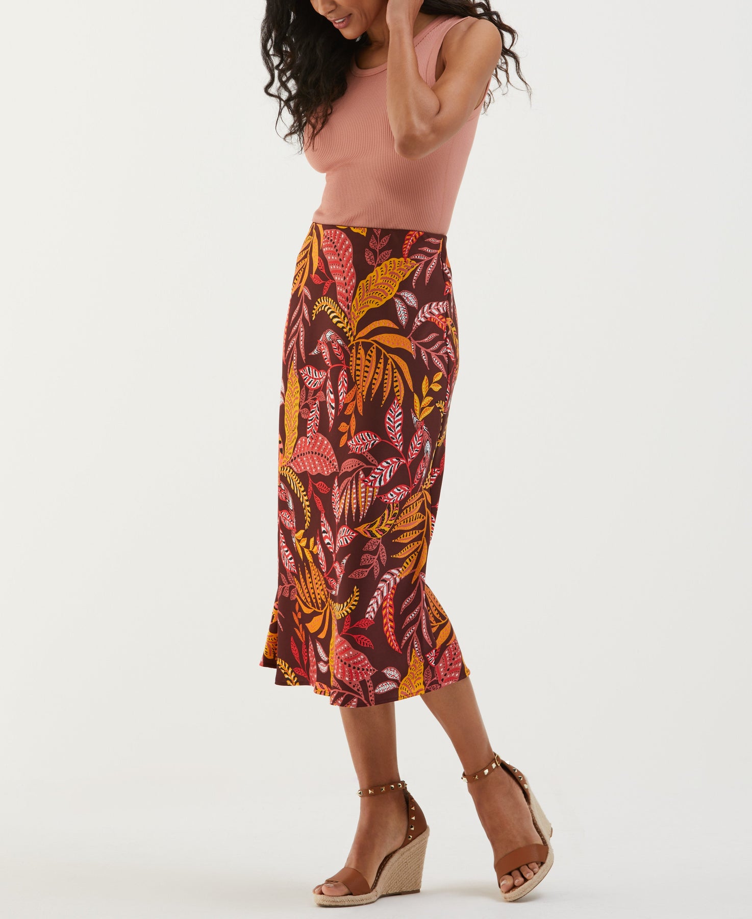 Leaf Print Shine Midi Bias Skirt (Decadent Chocolate)