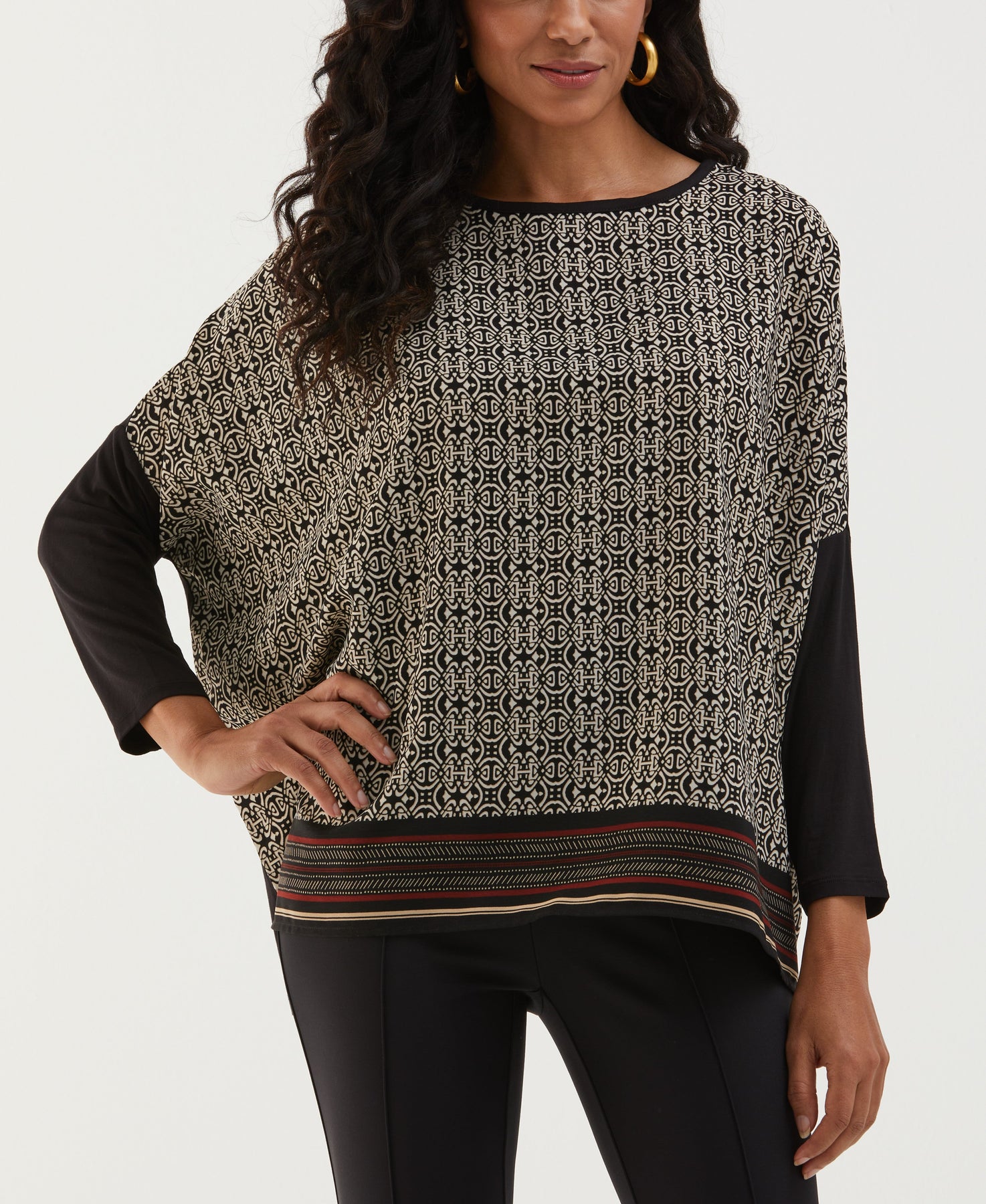 Covered with a funky medallion print, this ELLA Rafaella 3/4 sleeve women’s top will be an eye-catching addition to your wardrobe. It’s crafted with a woven fabric at the front and knit fabric at the back, which help to create an elegant, modern look. Great for everyday wear at family functions, at home or out on the town, the versatile ladies’ top has a classic crew neckline.