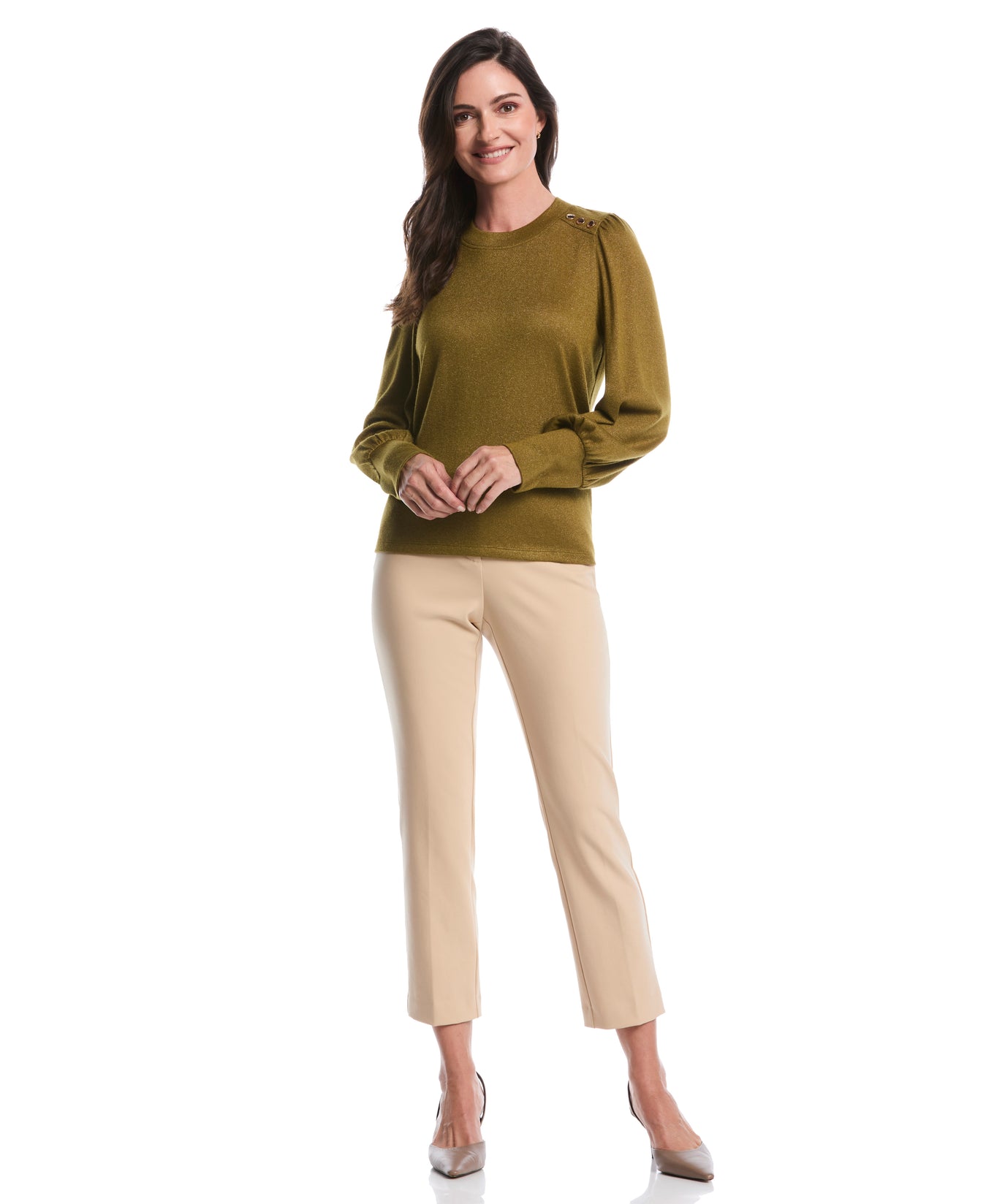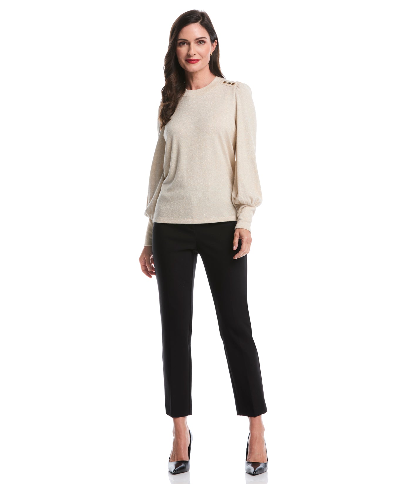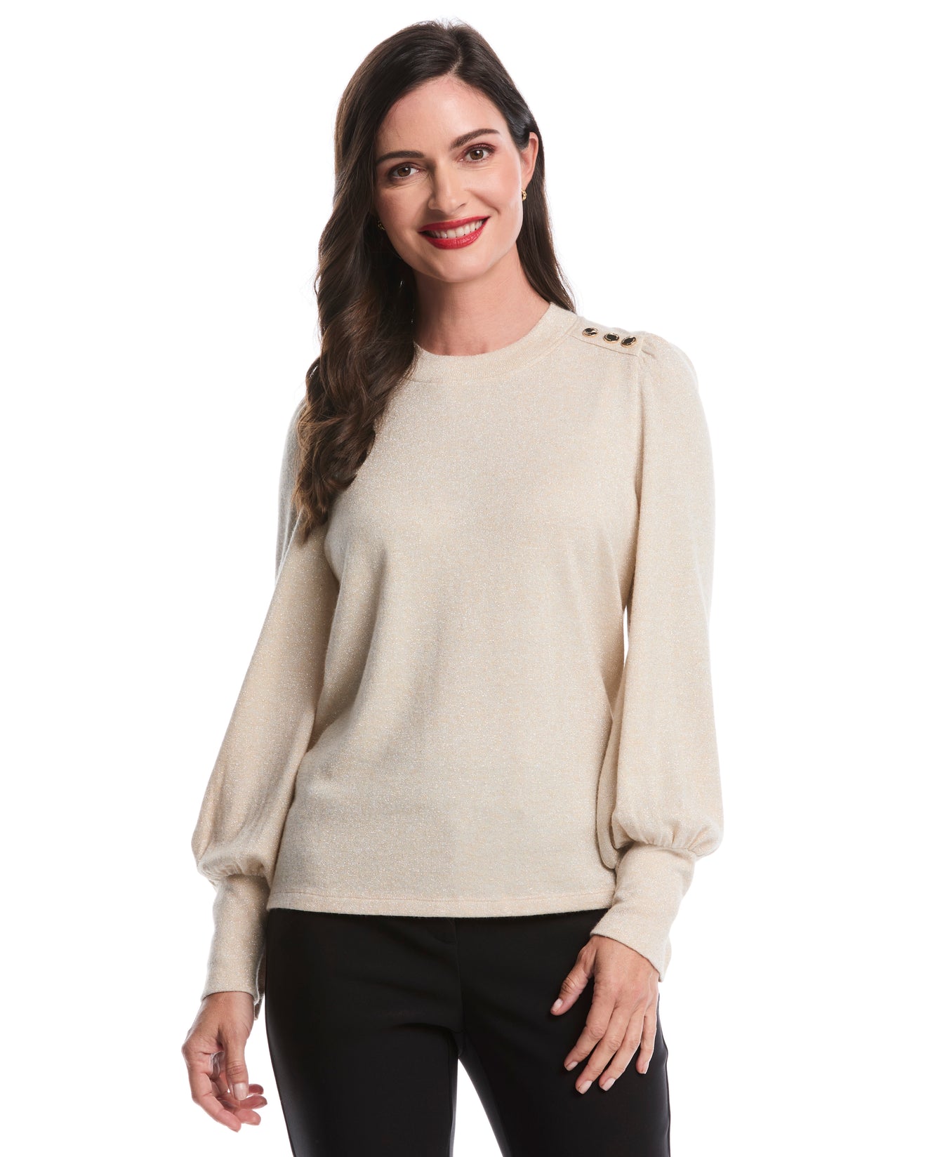 Stylish, flattering and comfortable, this Rafaella women's top checks all the boxes. The puff shoulders, decorative strapping and metallic fabric add fashionable details that take your look up a notch. This long sleeve top also features textured knit fabric with stretch for comfortable wear whether you're heading to the office or hitting the city for a date.