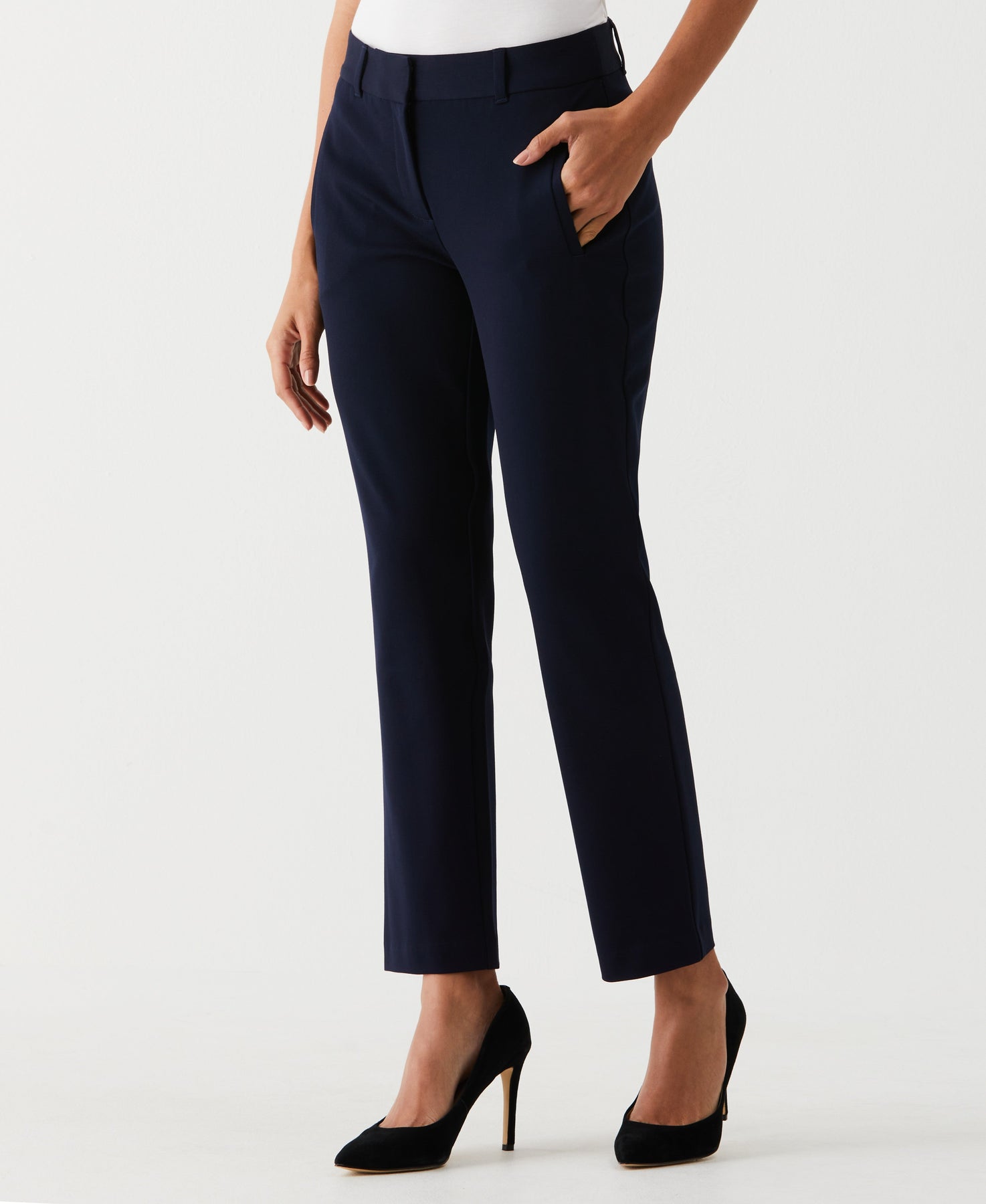 Functional and stylish, these Rafaella ladies' trousers are the ultimate wardrobe essential for working women. The ankle length design and classic fit can be paired with a range of shoes and tops in your wardrobe for versatile style while the hook and bar closure and front welt pockets provide added practicality and convenience. The slimming panel and faux back pockets on these pants for women help ensure a smooth silhouette while the belt loops and back darts provide a tailored fit and a polished finishing touch. Crafted from high-quality and comfortable gabardine fabric, these trousers for women have an flattering look you can wear from the office to an evening event with ease.