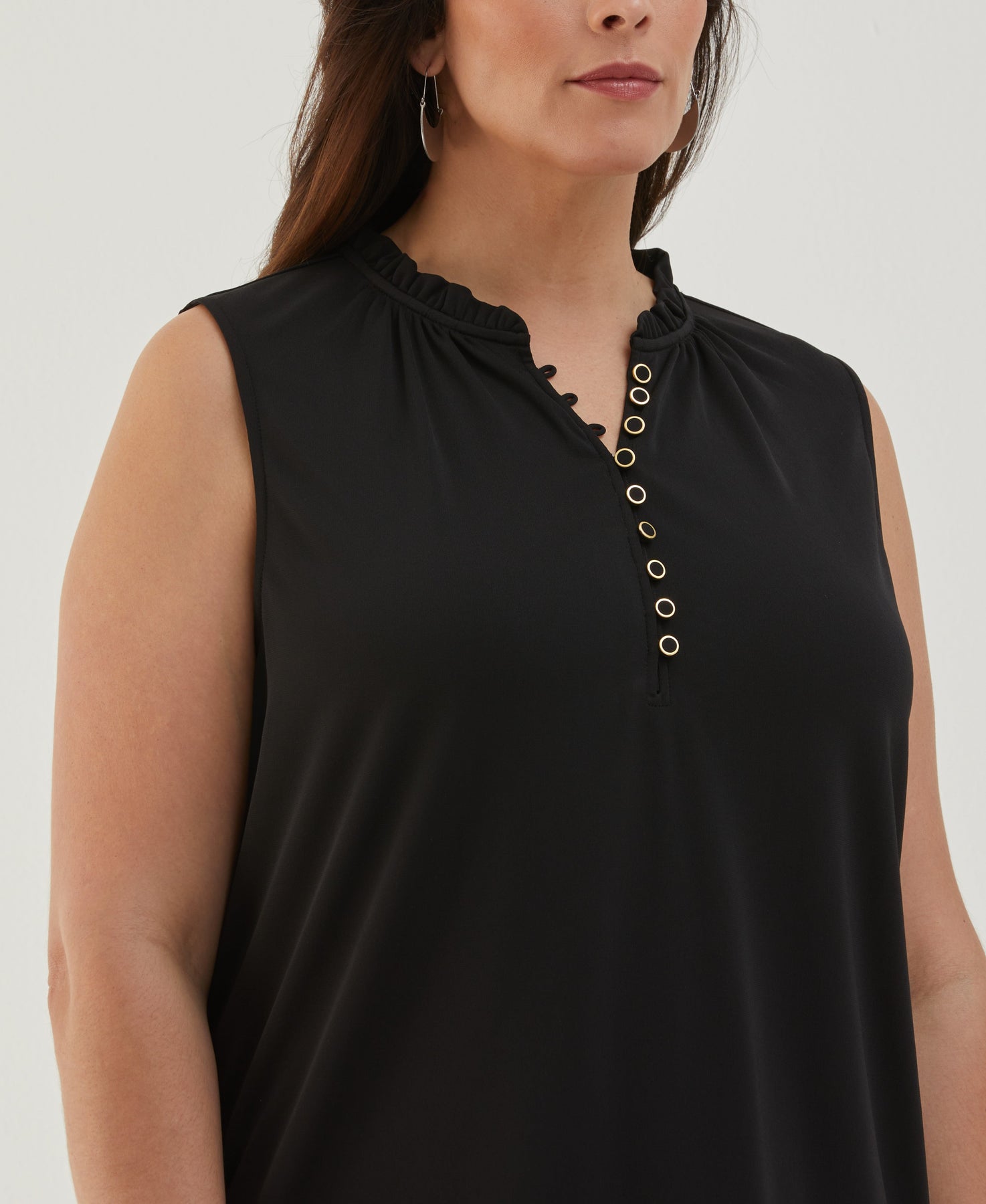 Update your warm weather wardrobe with this women’s sleeveless shirt from ELLA Rafaella. Crafted from soft and stretchy interlock knit fabric, the tank top offers a comfortable and flattering fit. It has a versatile solid-colored design that will complement many of your existing shorts, pants and skirts with ease. The split neck features ruffle trim for an eye-catching detail. Wear it buttoned all the way up for a lunch with coworkers, or open it up partway for a breezy, summer-ready look perfect for relaxing under a beach umbrella.