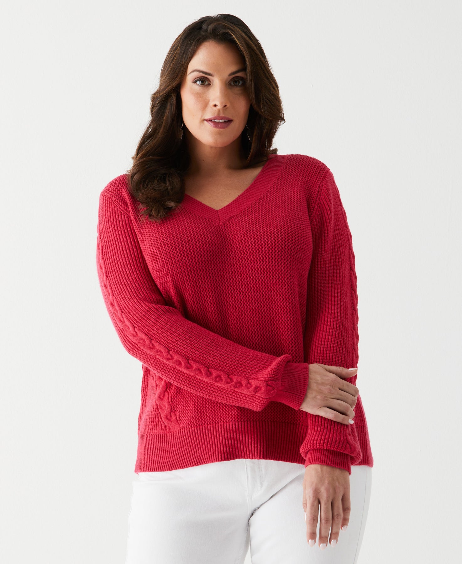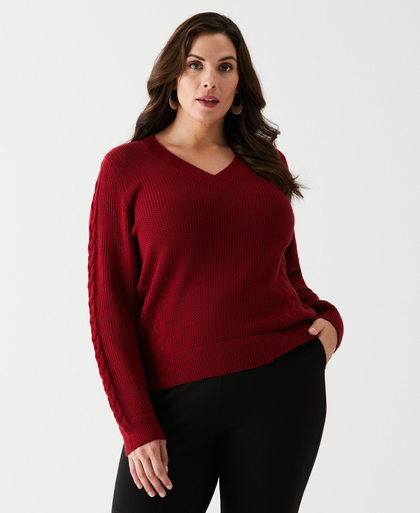 Stay warm and fashionable with this Ella Rafaella sweater for women. Featuring a modern silhouette, this sweater is design to flatter your curves while still providing a comfortable fit and feel. The V-neckline is perfect for layering with your favorite tops while the ribbed hem, cuffs and collar and cable knit detailing add a cozy and stylish touch. This long sleeve sweater is waist length making it easy to pair with leggings, skinny jeans and trousers for versatile wear.