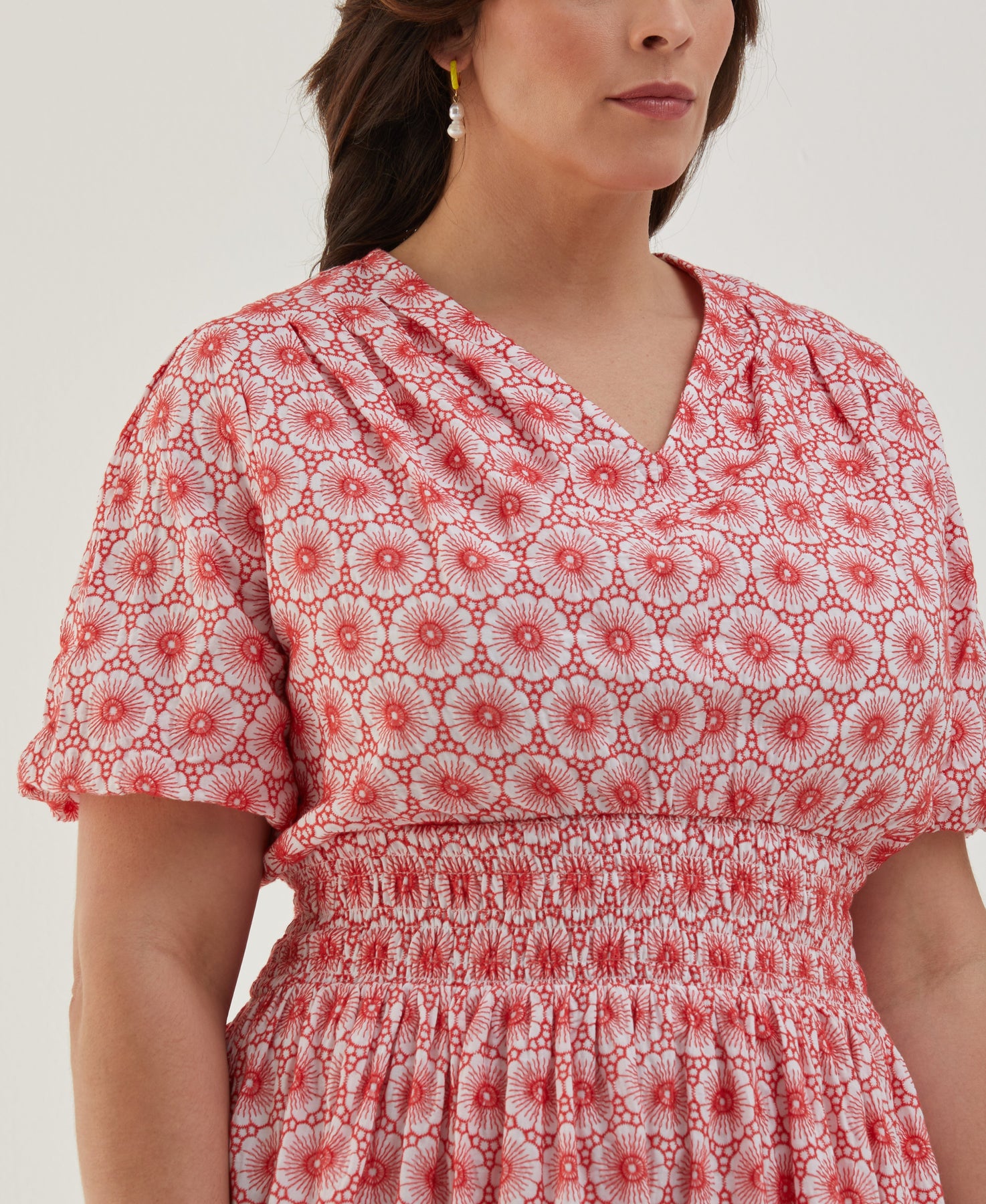 Plus Size Daisy Embroidered Smocked Puff Sleeve Dress (Hibiscus)