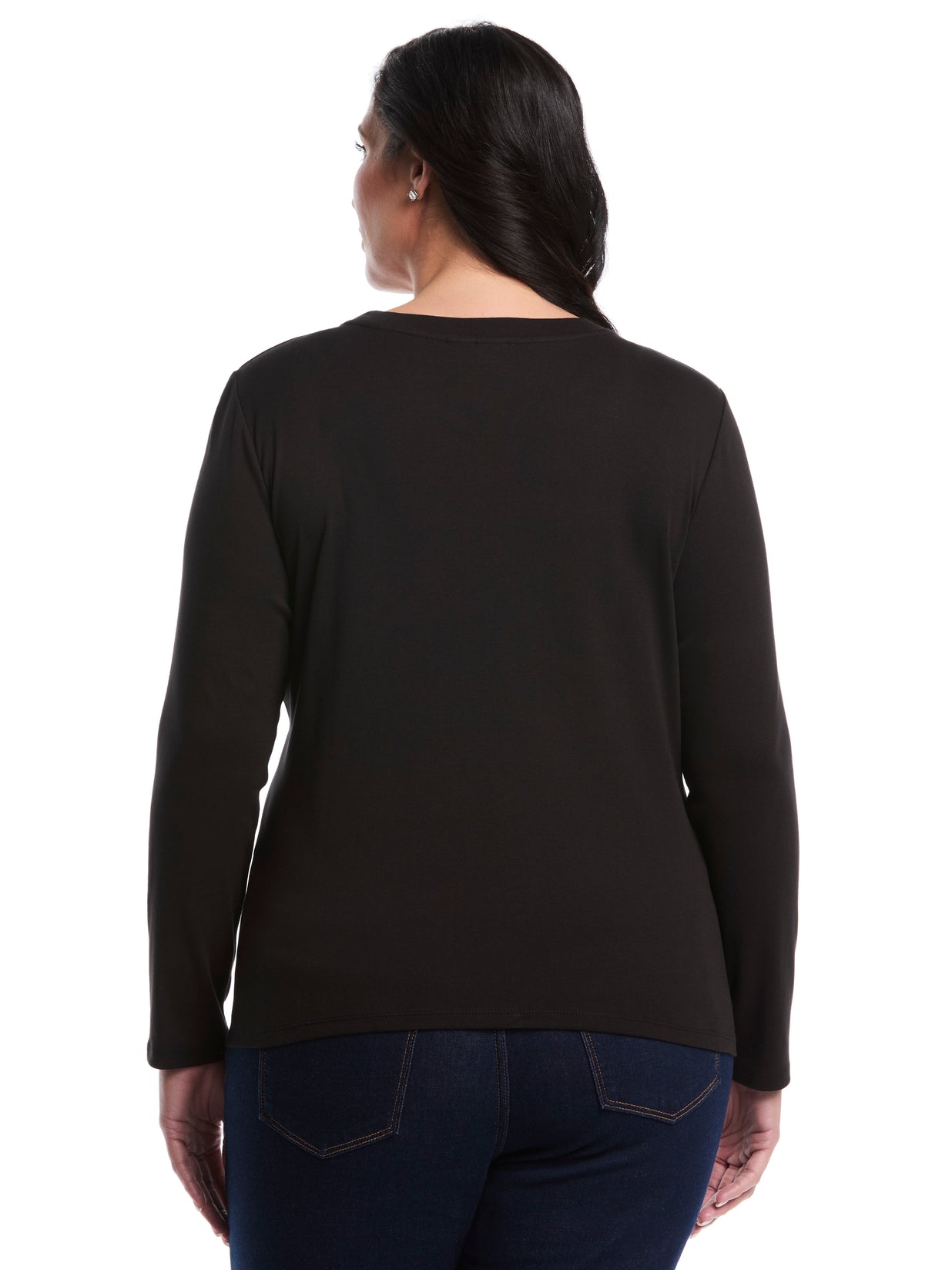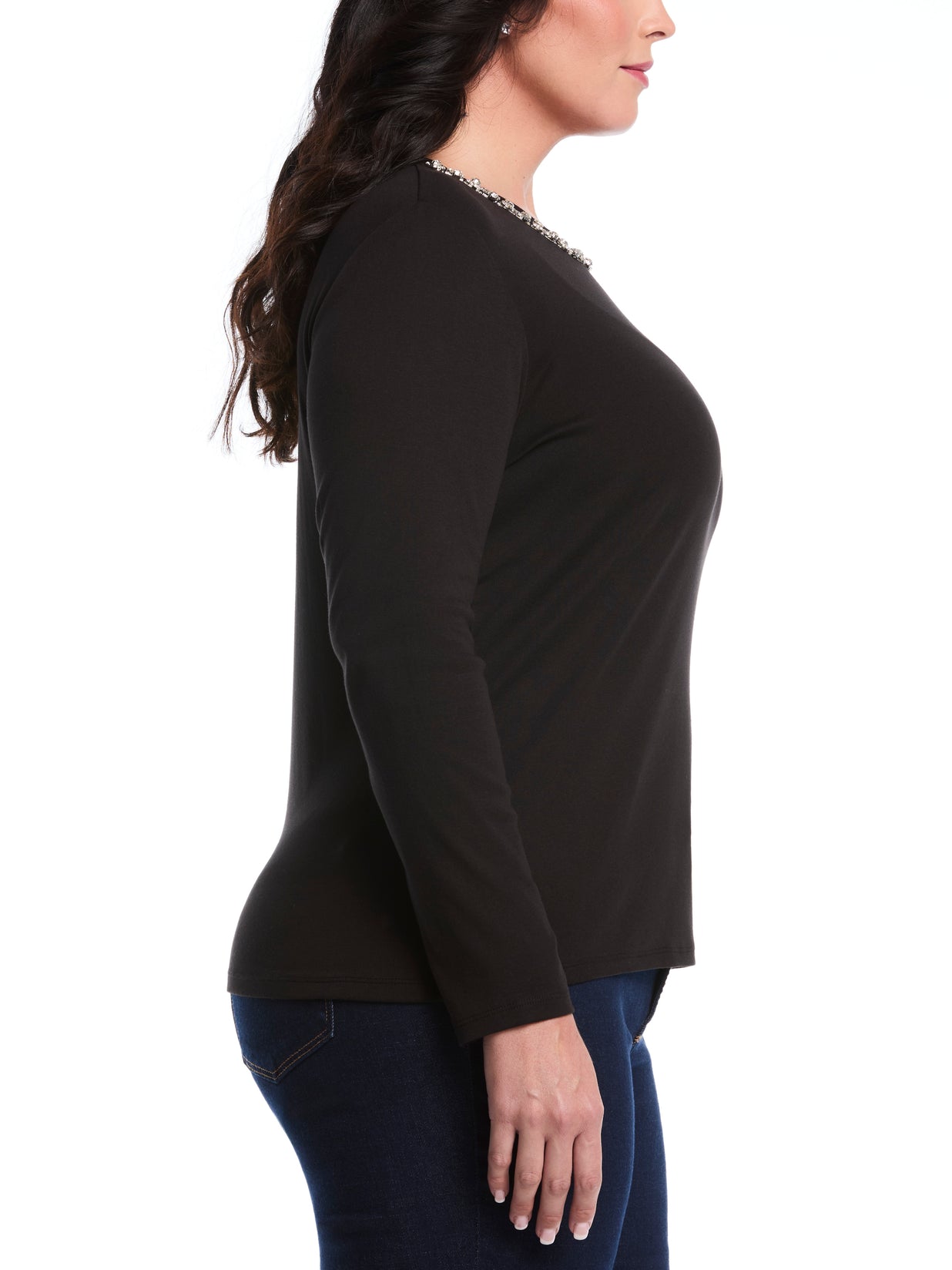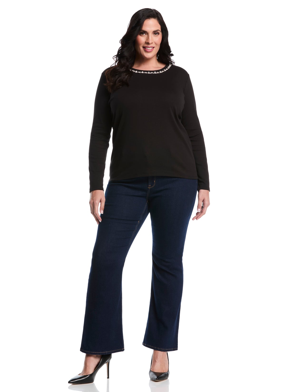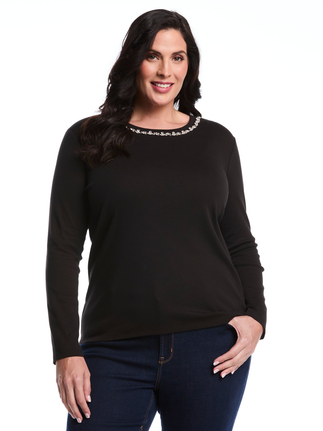 Cozy style can still be chic with this Rafaella women's top. The crew neck is adorned with faux pearls and rhinestones to add a bit of sparkling glamour to your smart-casual look. Made for effortless wear, this long sleeve top has a flattering and comfortable classic fit while the ribbed cotton fabric adds visual interest and texture.