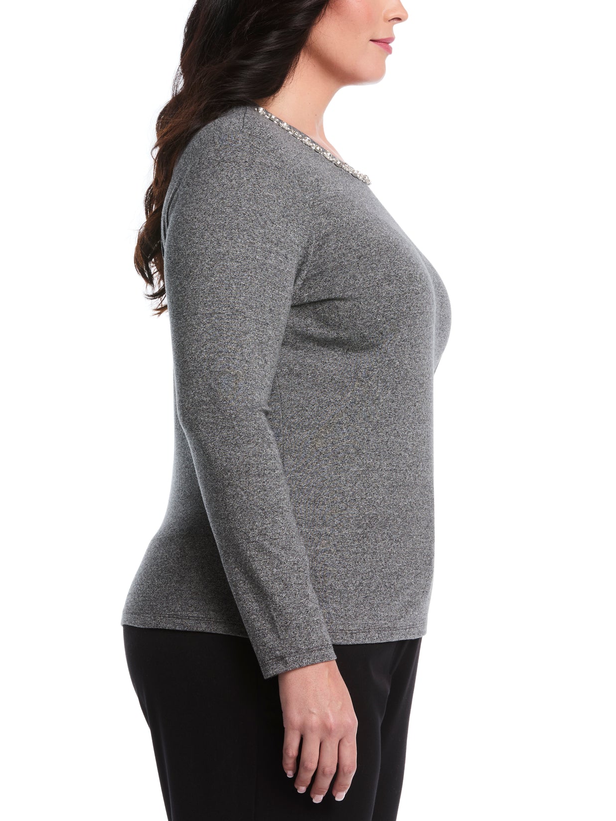Cozy style can still be chic with this Rafaella women's top. The crew neck is adorned with faux pearls and rhinestones to add a bit of sparkling glamour to your smart-casual look. Made for effortless wear, this long sleeve top has a flattering and comfortable classic fit while the ribbed cotton fabric adds visual interest and texture.