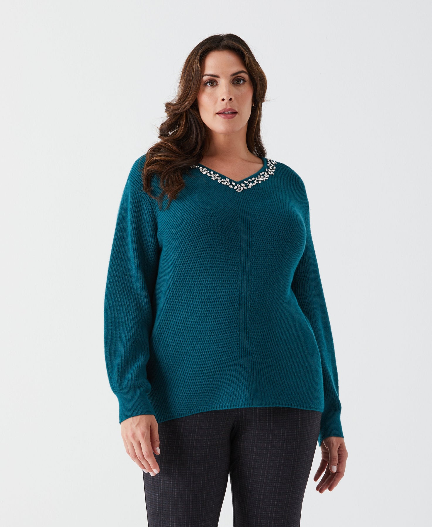This elegant women's sweater from Ella Rafaella is all about the details. A textured ribbed sweater knit fabric adds softness and warmth, while faux crystal and pearl embellishments at the V-neck collar elevate the versatile design. The modern fit and 25" hip length help make this long sleeve sweater a flattering and comfortable option for day or night.