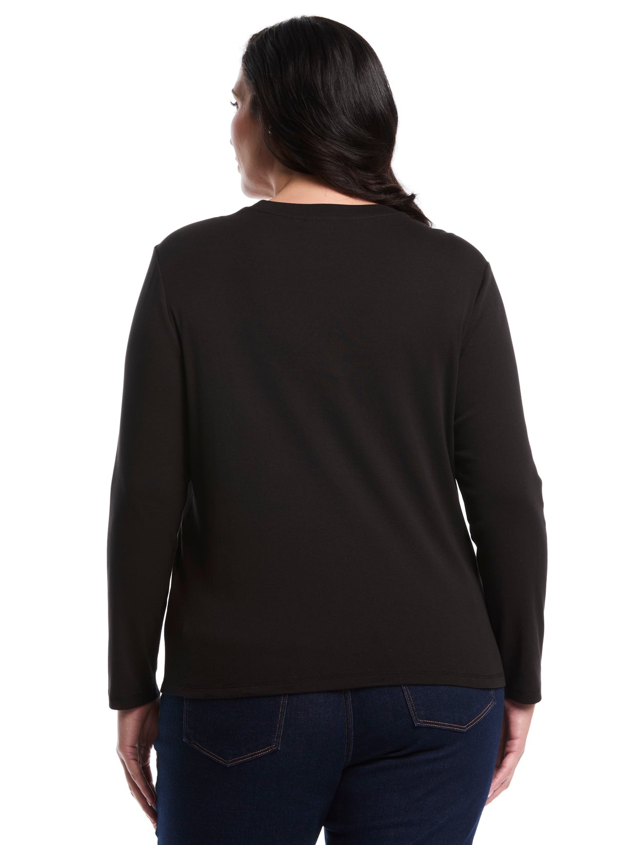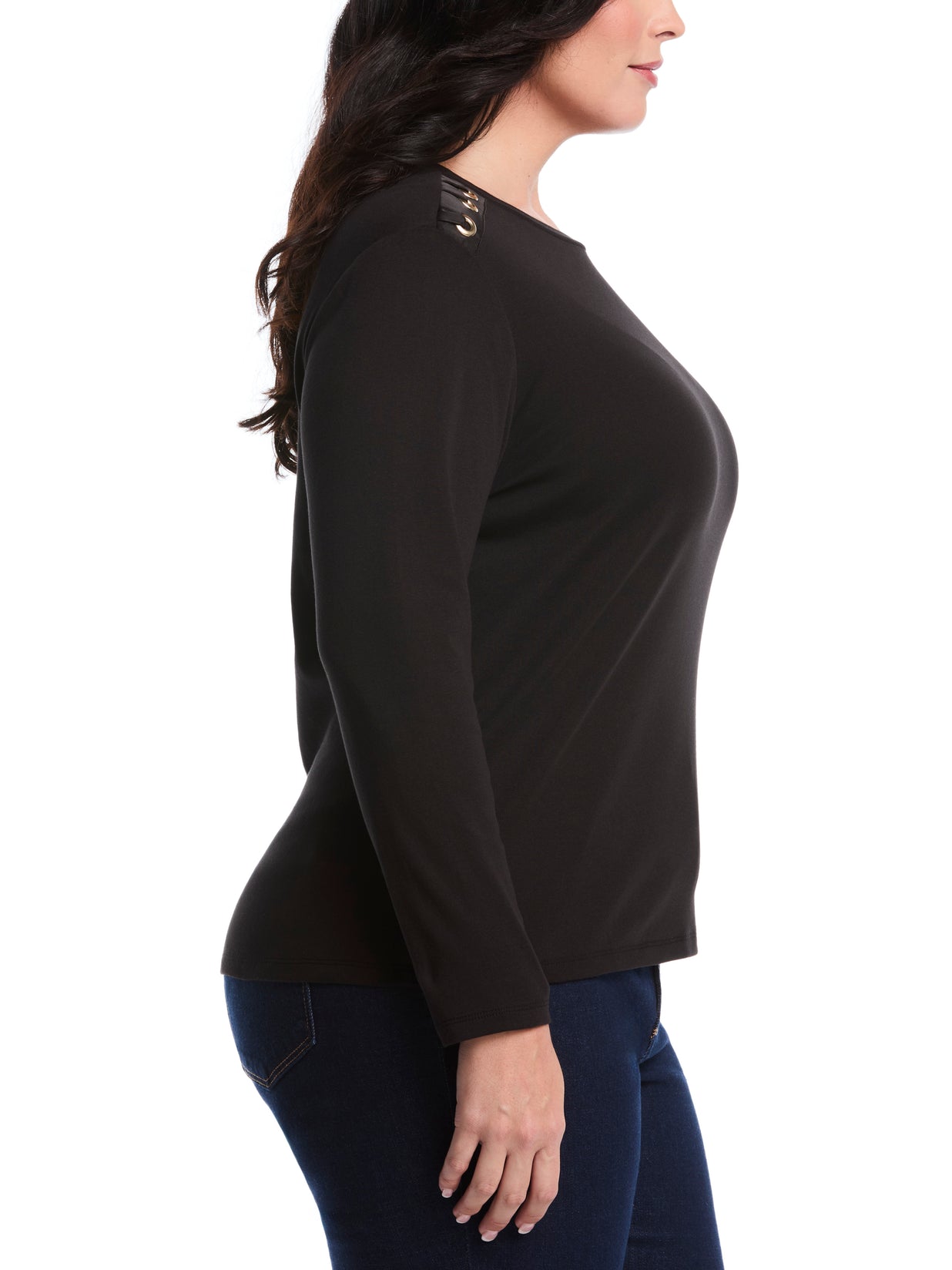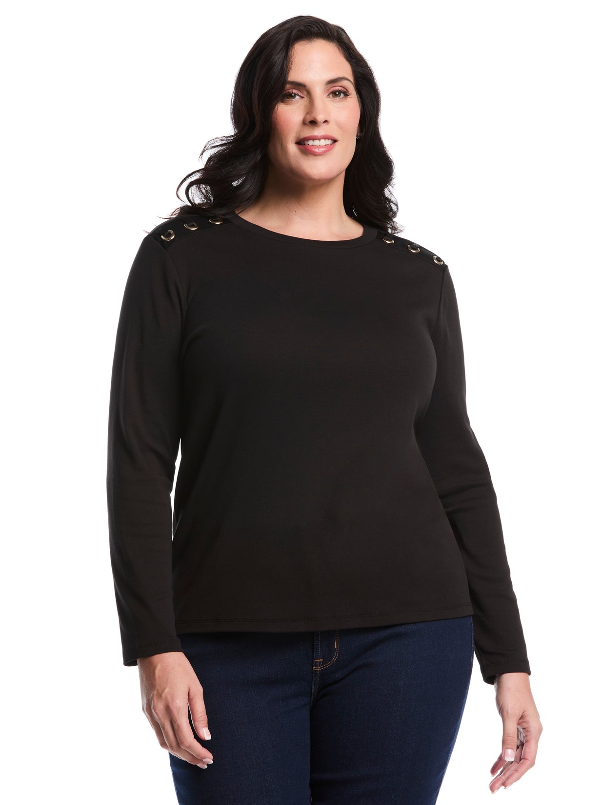 Designed for the modern woman, this Rafaella blouse features gold rivets and laced detailing to give your office wear an extra stylish edge. The solid color design makes it easy to pair with a range of dress pants for no-fuss styling on workdays and can also be paired with jeans on the weekend for versatility. The classic fit, ribbed cotton fabric and crew neck design makes this women's top comfortable to wear all day.