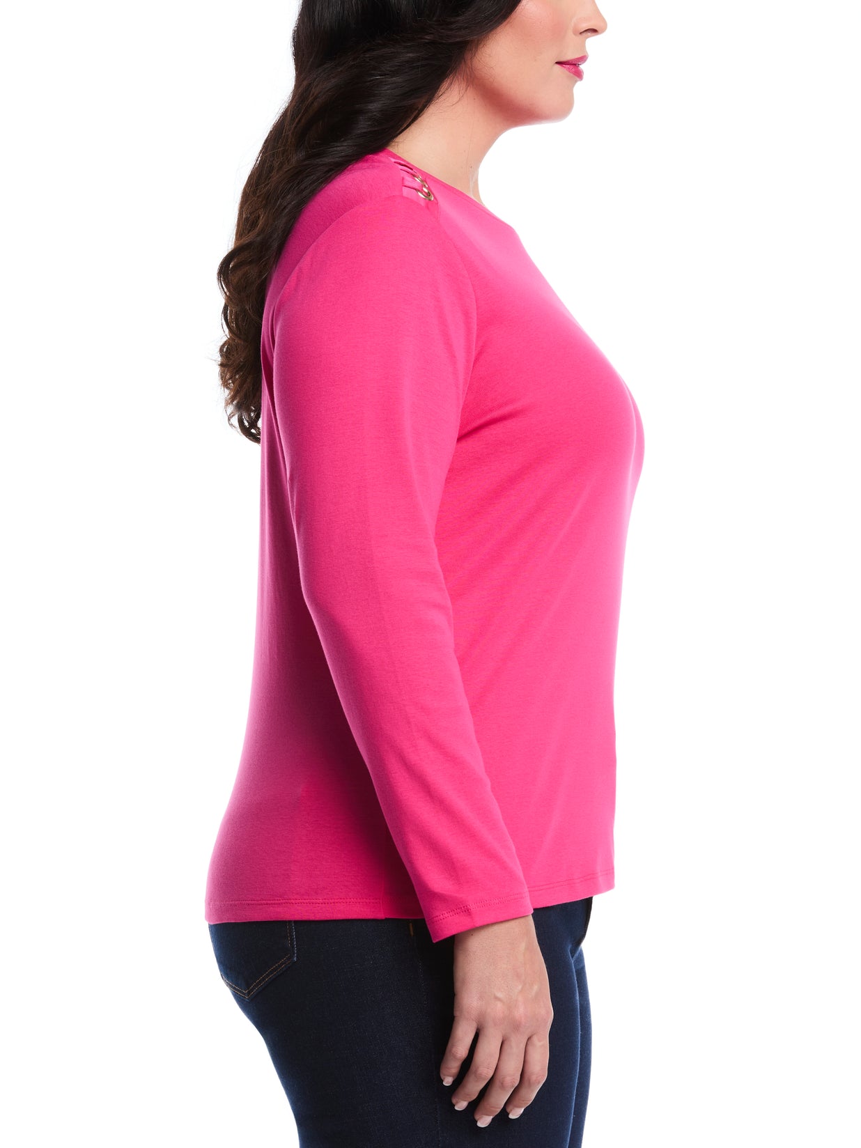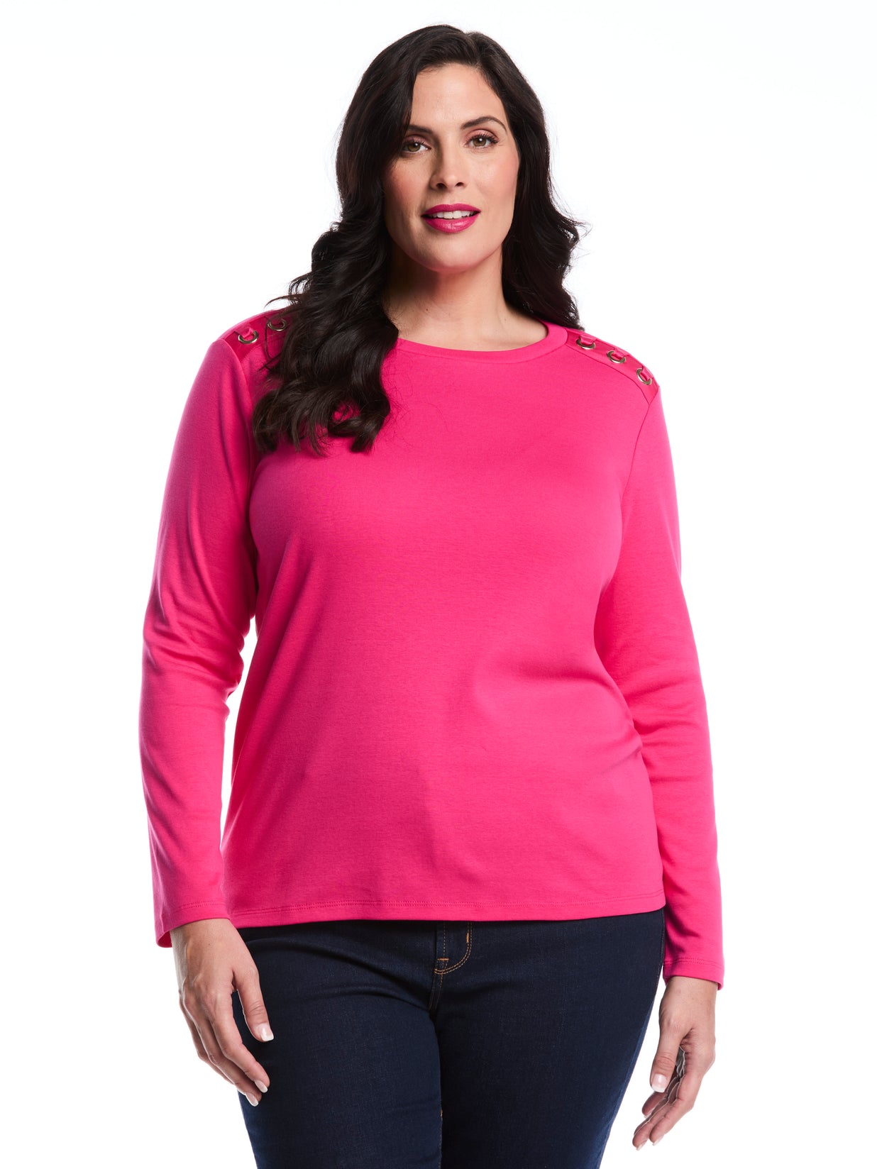 Designed for the modern woman, this Rafaella blouse features gold rivets and laced detailing to give your office wear an extra stylish edge. The solid color design makes it easy to pair with a range of dress pants for no-fuss styling on workdays and can also be paired with jeans on the weekend for versatility. The classic fit, ribbed cotton fabric and crew neck design makes this women's top comfortable to wear all day.