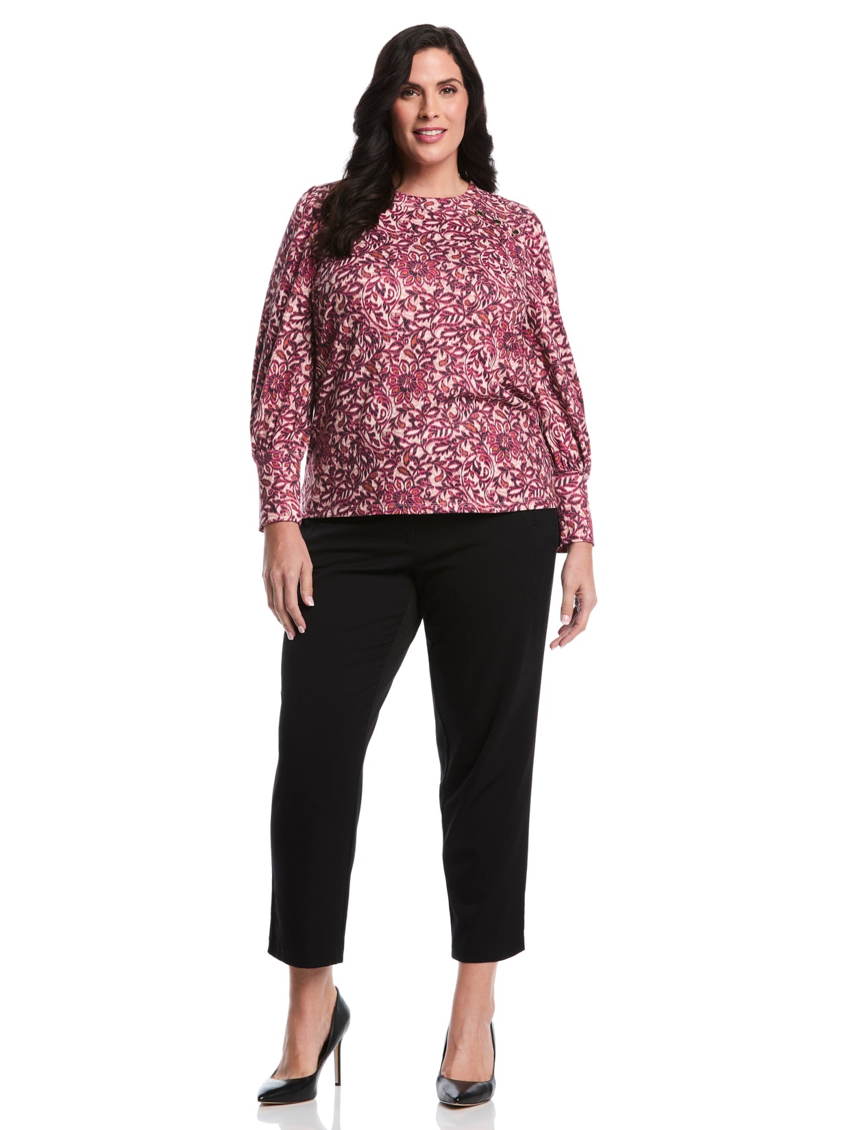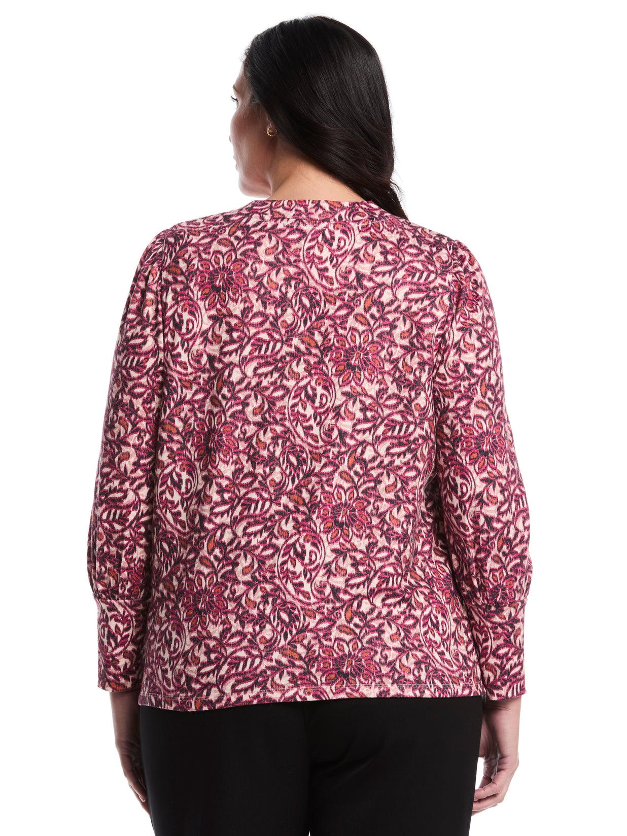 Comfortable and elegantly stylish, this Rafaella women's top will become one of your go-to pieces this season. The pretty paisley pattern, gold rivets and puff sleeve detailing on this long sleeve top dress up any outfit, allowing you to go seamlessly from day to night. It's crafted from a texture knit fabric with stretch for easy wear.