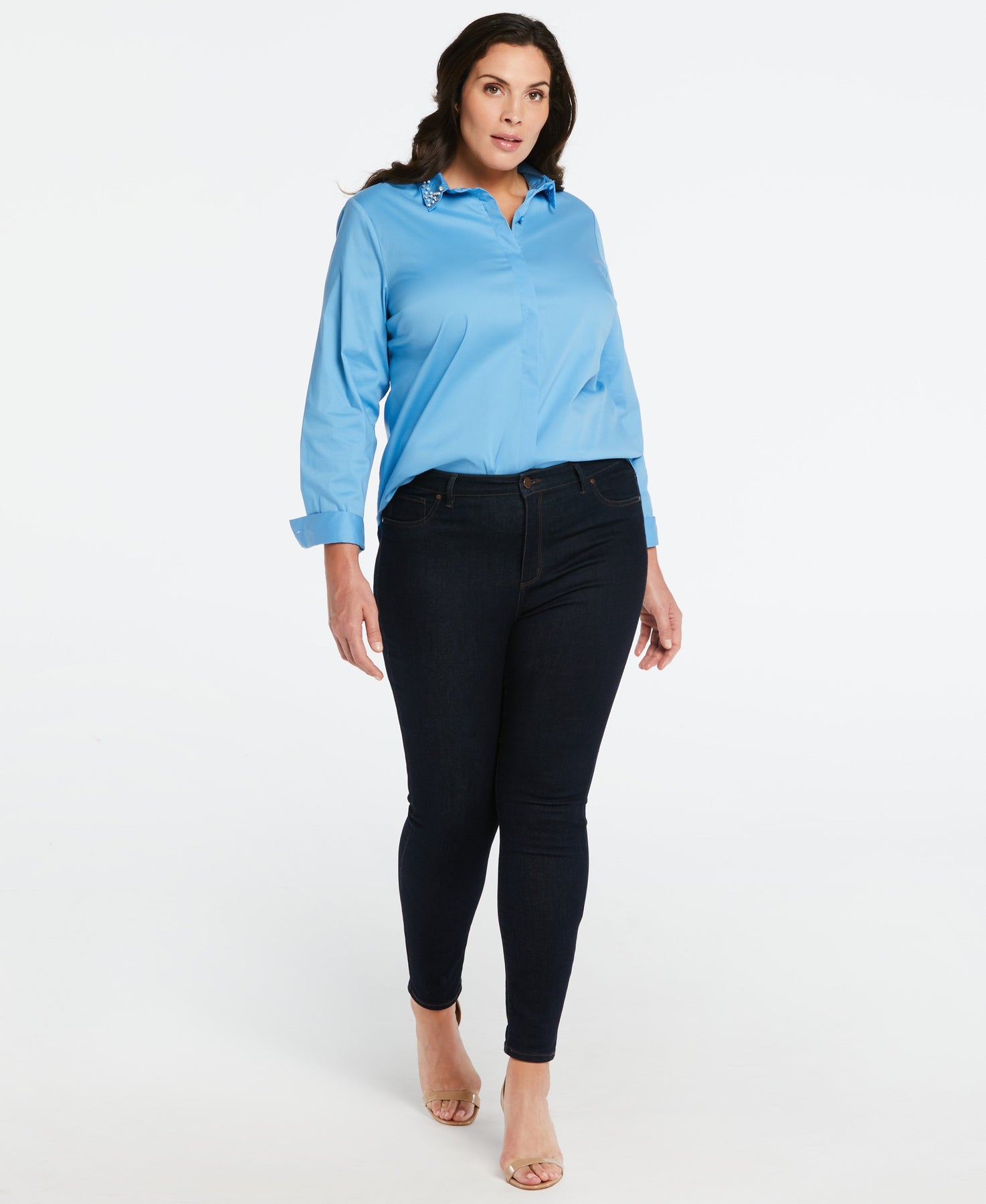 Looking for a modern, glam twist on the classic collar blouse? Made from cool poplin, it's lightweight and breathable, making it ideal for warmer days. Faux pearls and rhinestones add a touch of luxe. The perfect blouse for dinner and a show.