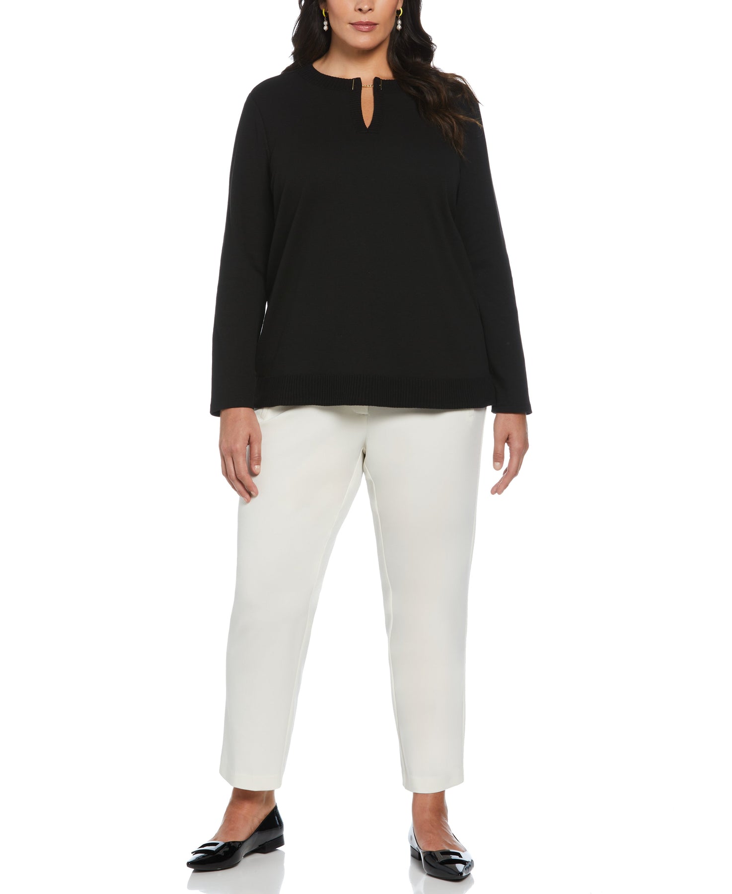 Designed to move from a day at the office to a night out with ease, this versatile women’s top from Rafaella is made with rib-knit fabric for subtle texture. The long sleeve women’s top has a stylish split neck, with an attached metal chain for an eye-catching accent. Easy to wear in any season or setting, it has a classic fit.