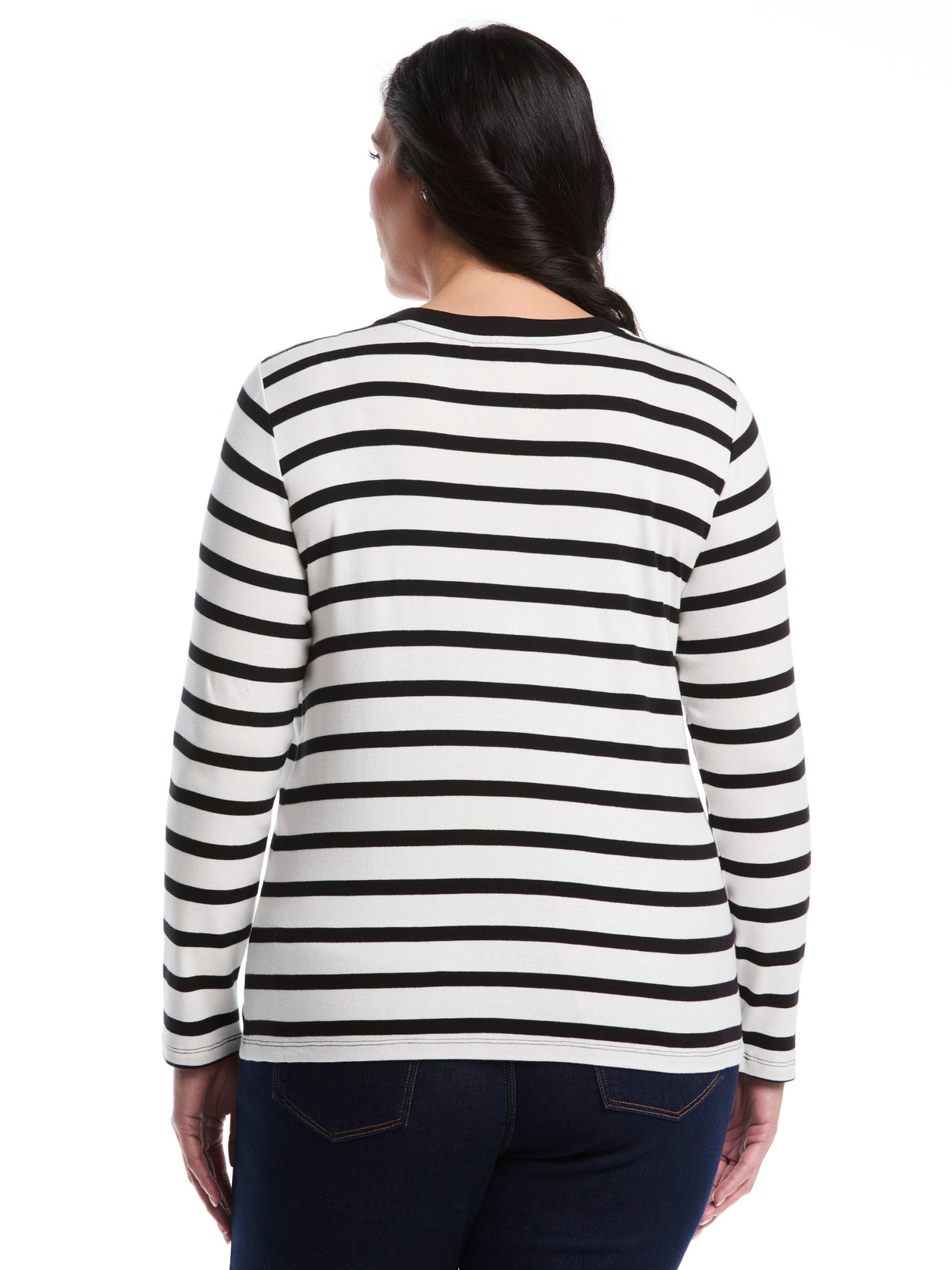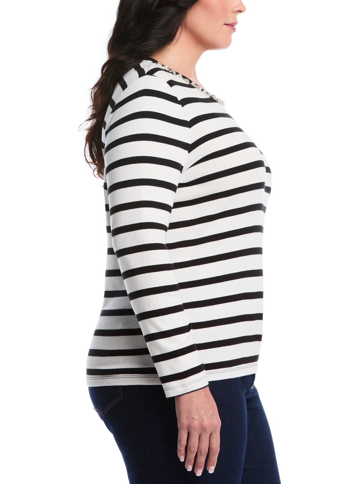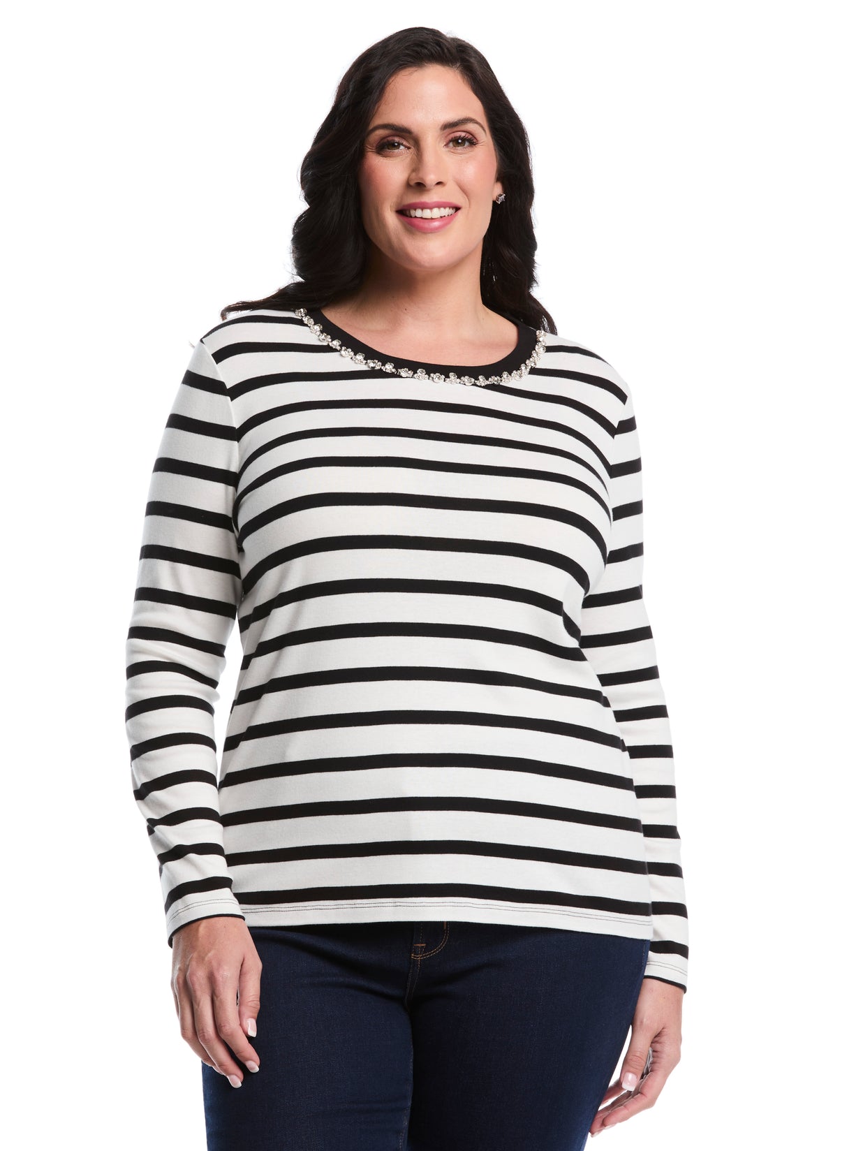 From the office to girls' nights, this Rafaella women's top lets your style shine. Embellished with a faux pearl and rhinestone trim along the neckline, this long sleeve top gives your look a sparkling finish. The striped pattern adds an extra stylish twist while the classic fit ribbed cotton fabric offers all-around comfort. Whether dressed up or down, this women's top keeps your look on point.