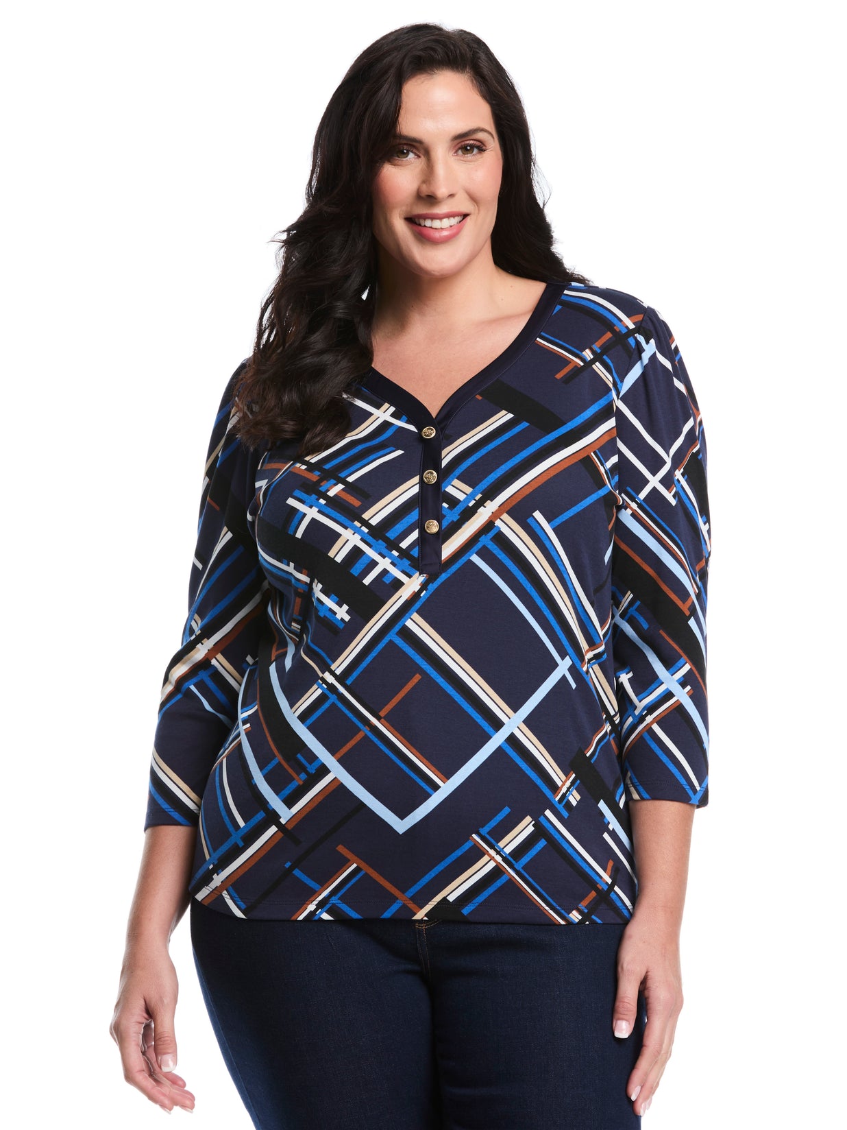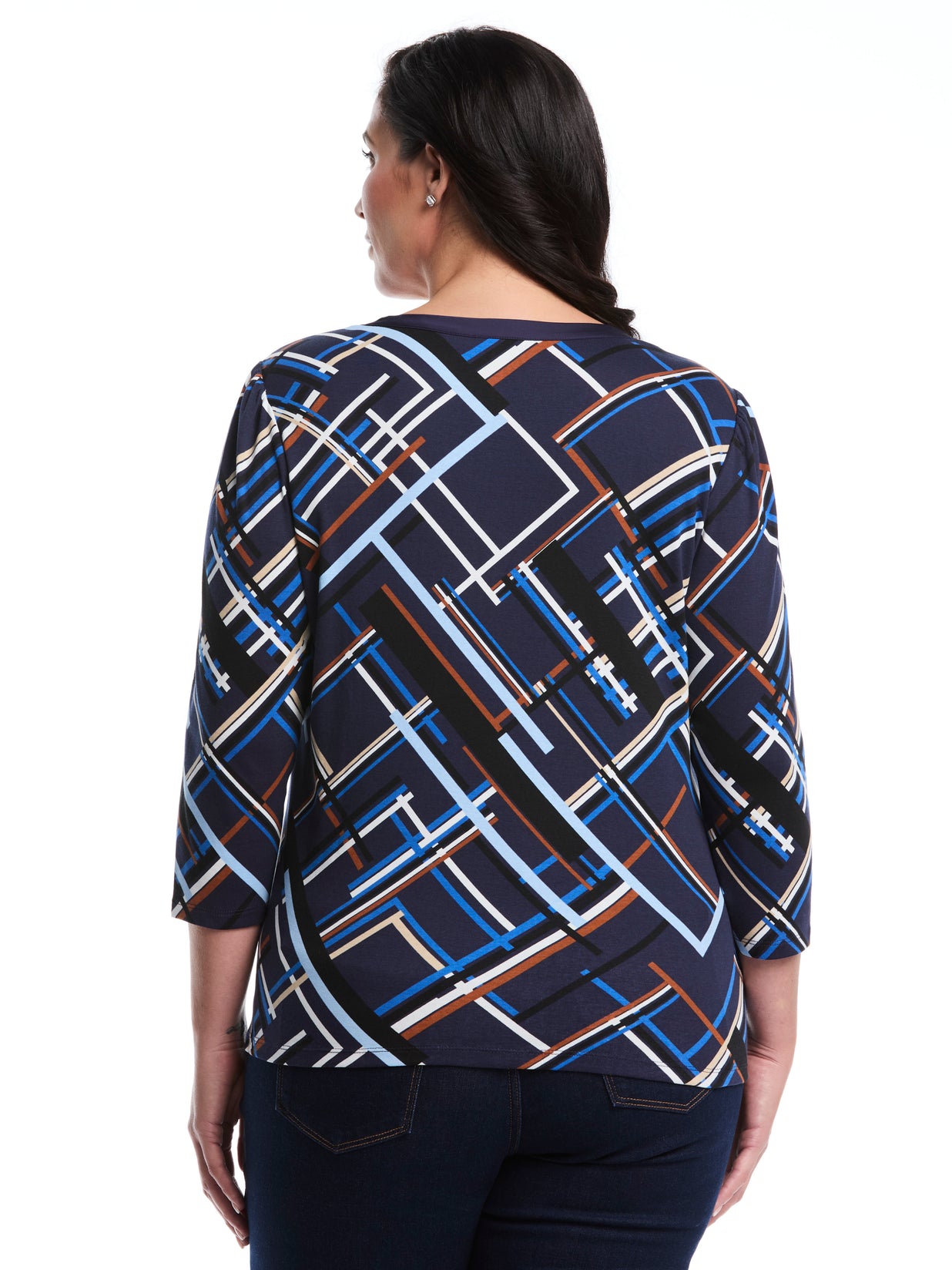 NEW! Plus Size Tossed Stripe Print 3/4 Puff Sleeve V-Neck Top