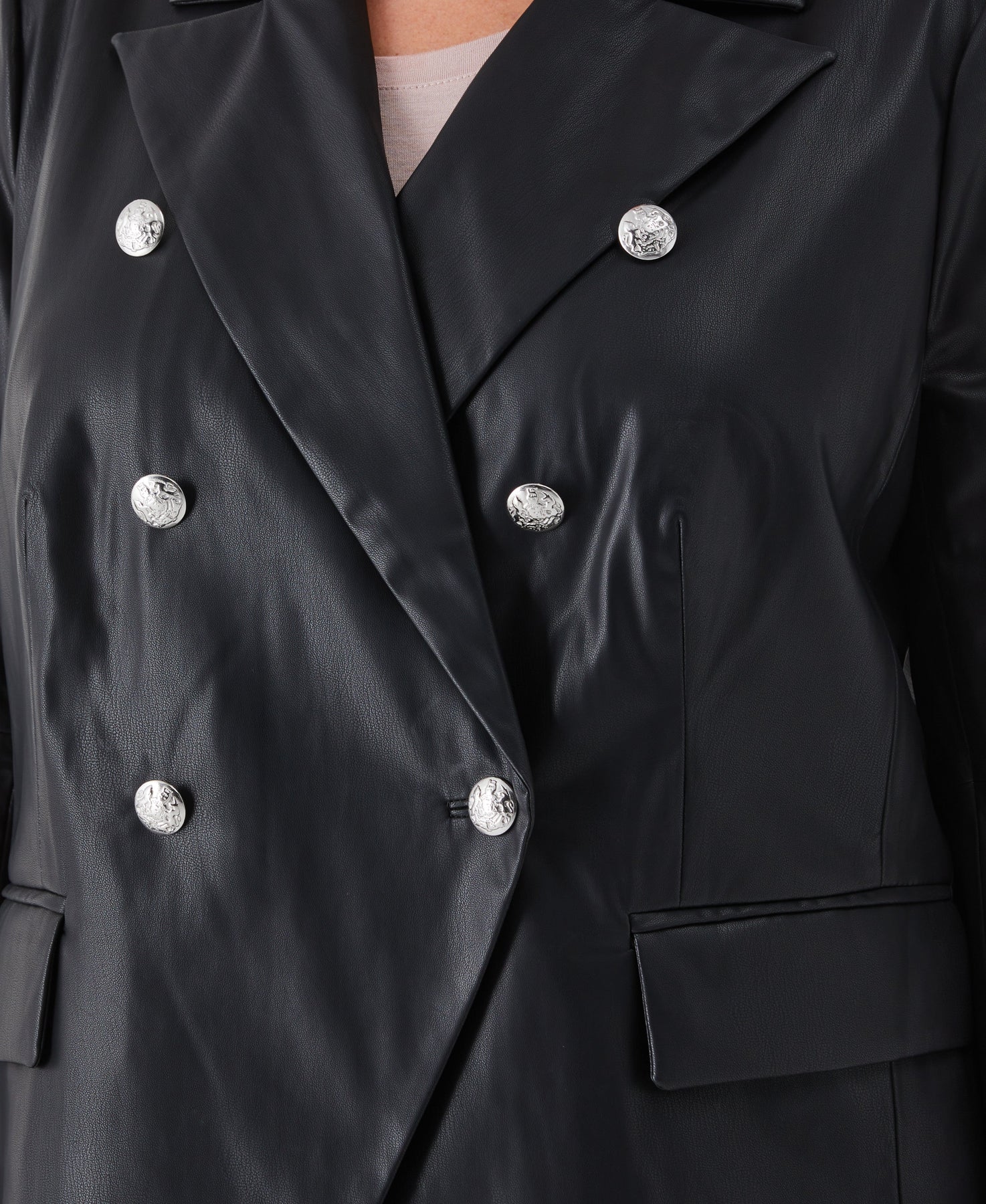 A cool look for the cool weather, this Ella Rafaella women's blazer is a chic addition to any outfit. This hip-length, double-breasted jacket features silver metal dome buttons, a peaked lapel, and vented sleeve openings with buttons. It’s fully lined, has shoulder pad inserts for added structure, and features front flap pockets for convenience. Made from 100% polyurethane vegan leather, this blazer jacket combines classic style with ethical fashion considerations.