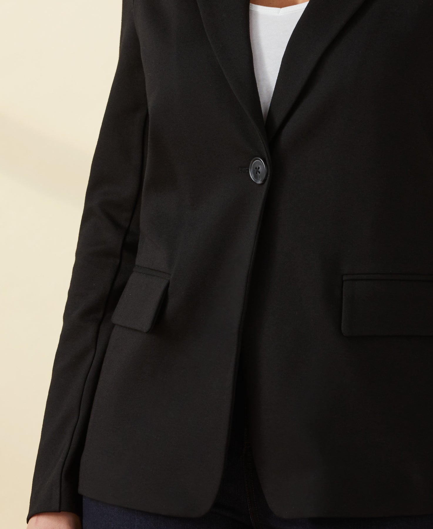 Complete your office outfits with this sharp blazer from Rafaella. The women’s blazer has a sleek modern fit, and it’s made with Ponte knit fabric that offers both a smooth, structured look and a hint of comfortable stretch. The single breasted women’s jacket is completed by a single button closure, two front pockets and classic notched lapels.