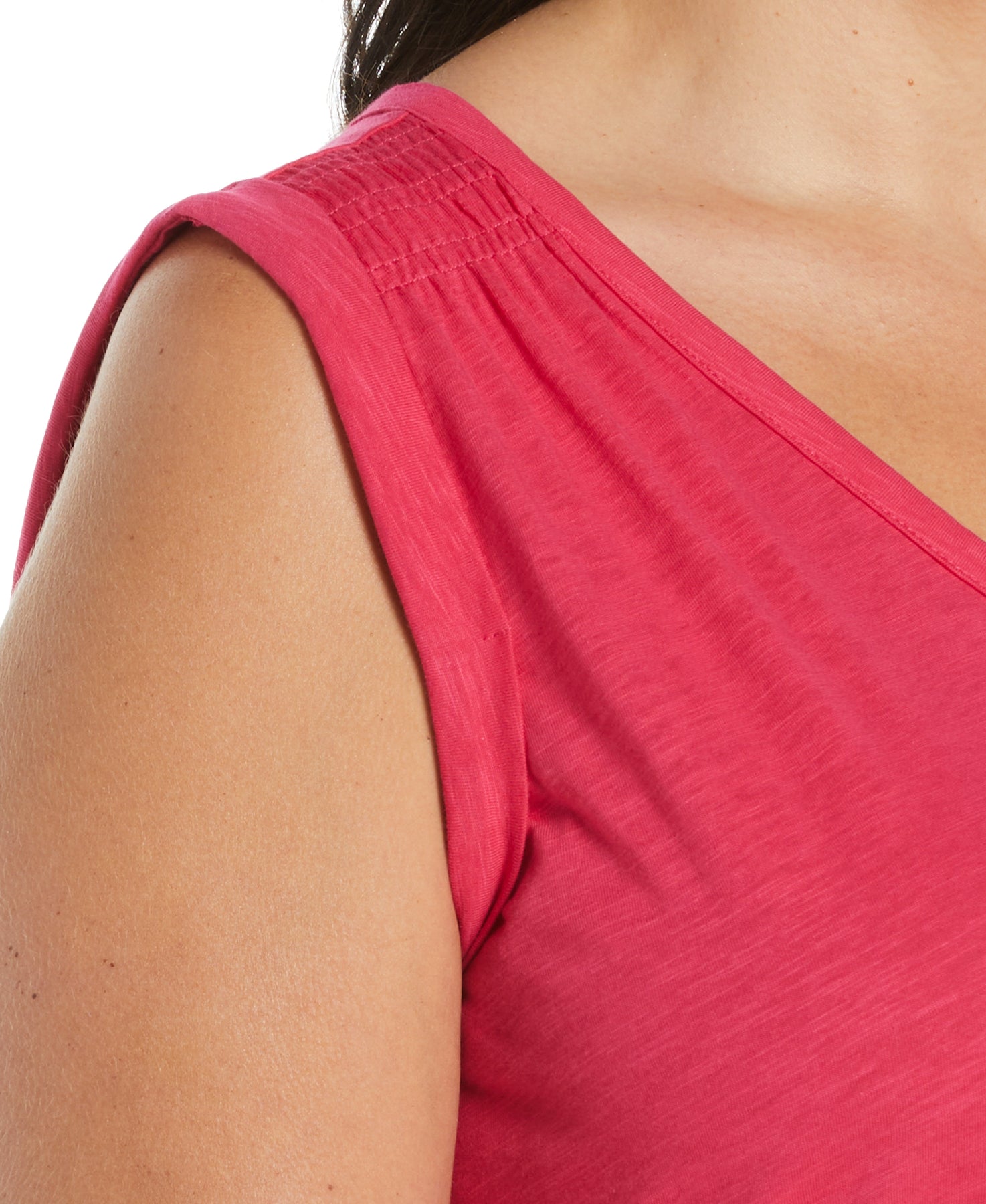 Smocking at the shoulders brings a subtle twist to this versatile solid-colored sleeveless top from Ella. The ladies’ top is crafted from 100% organic cotton, which offers impressive softness and breathability to help you stay comfortable in warm and sunny weather. The flattering V-neck and solid design make it great for wearing as a standalone piece on the weekends as well as layered under a cardigan or blazer during the work week.