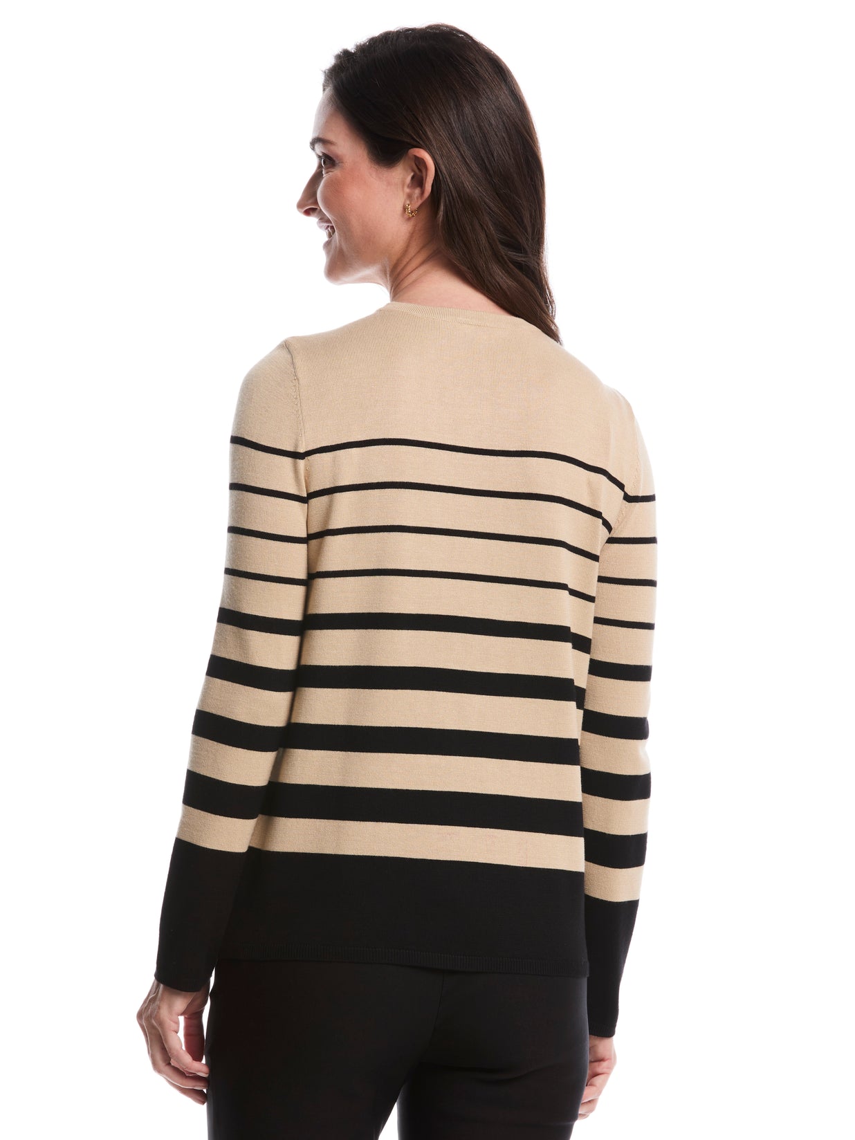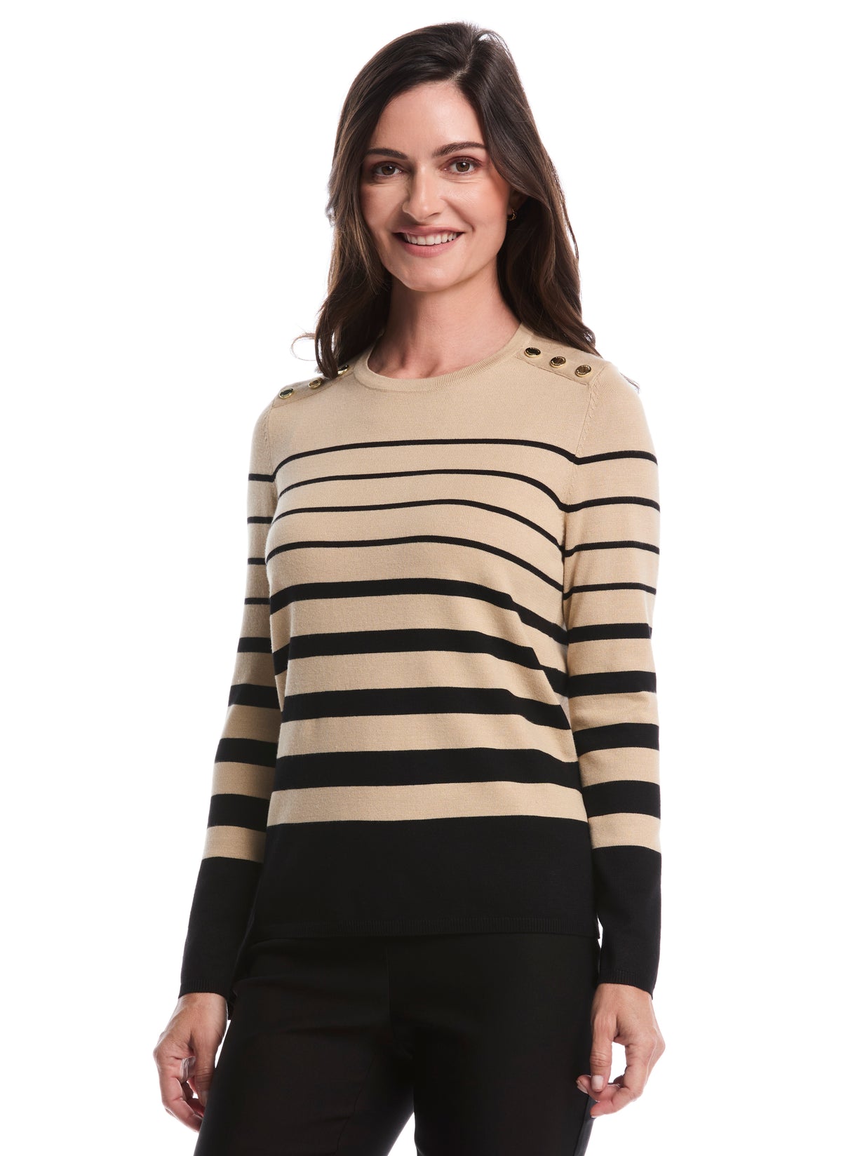 Featuring a striped design, this women's pullover sweater from Rafaella offers a classic look you can wear seamlessly from weekdays to the weekend. The gold-toned rivets on the shoulders of this sweater add a stylish twist to take your smart-casual wear to the next level. Plus, the classic fit offers comfortable all-day wear.