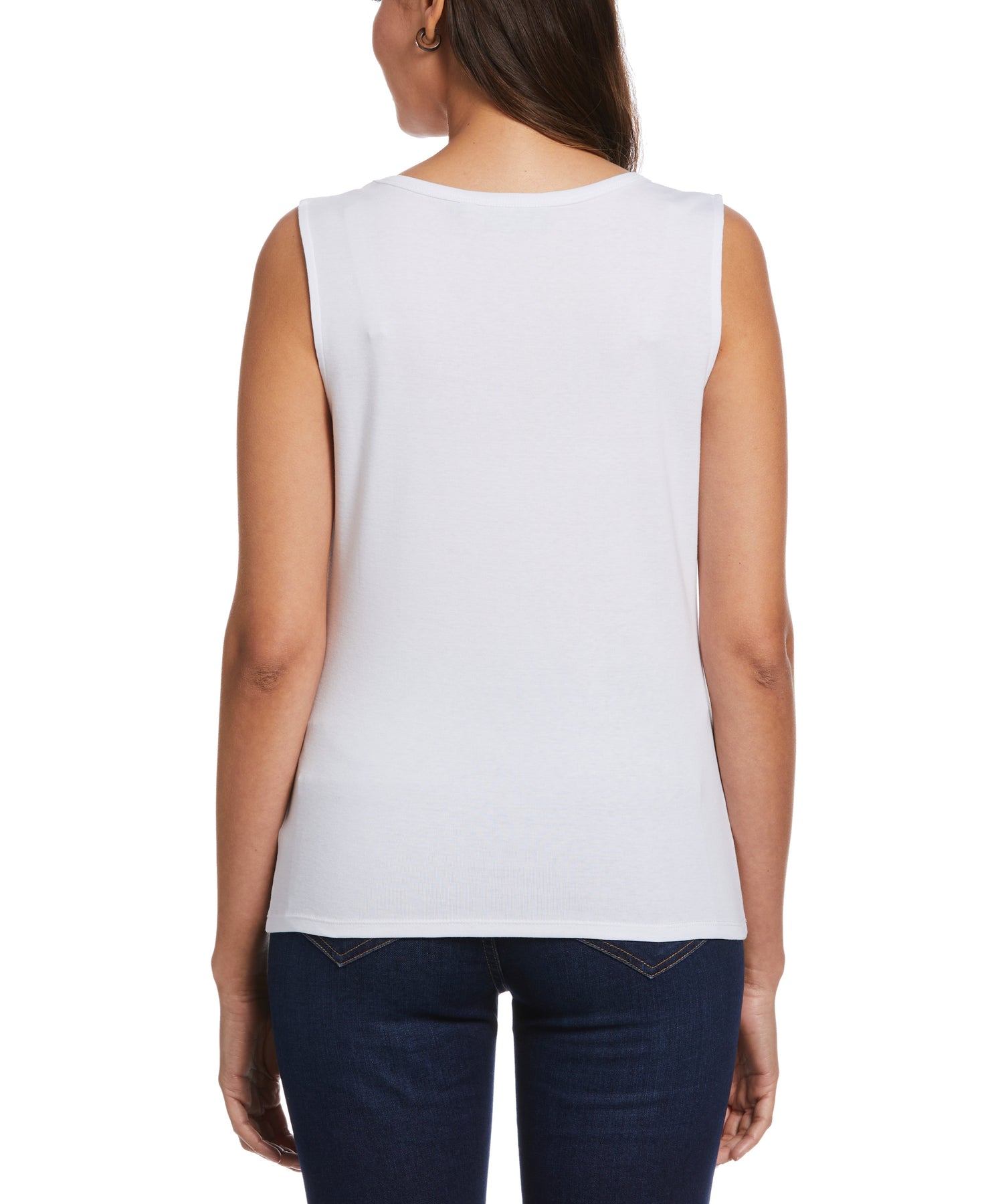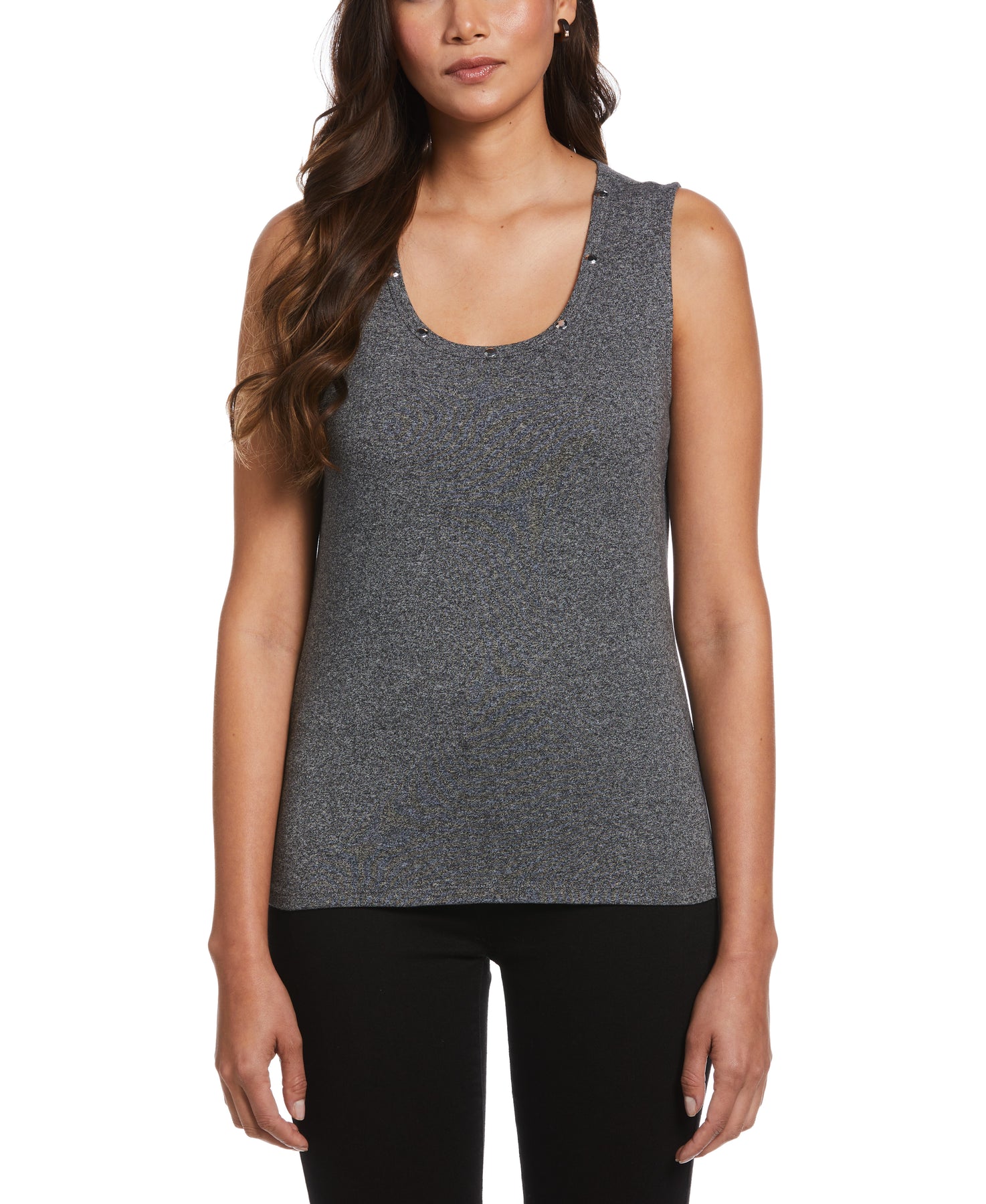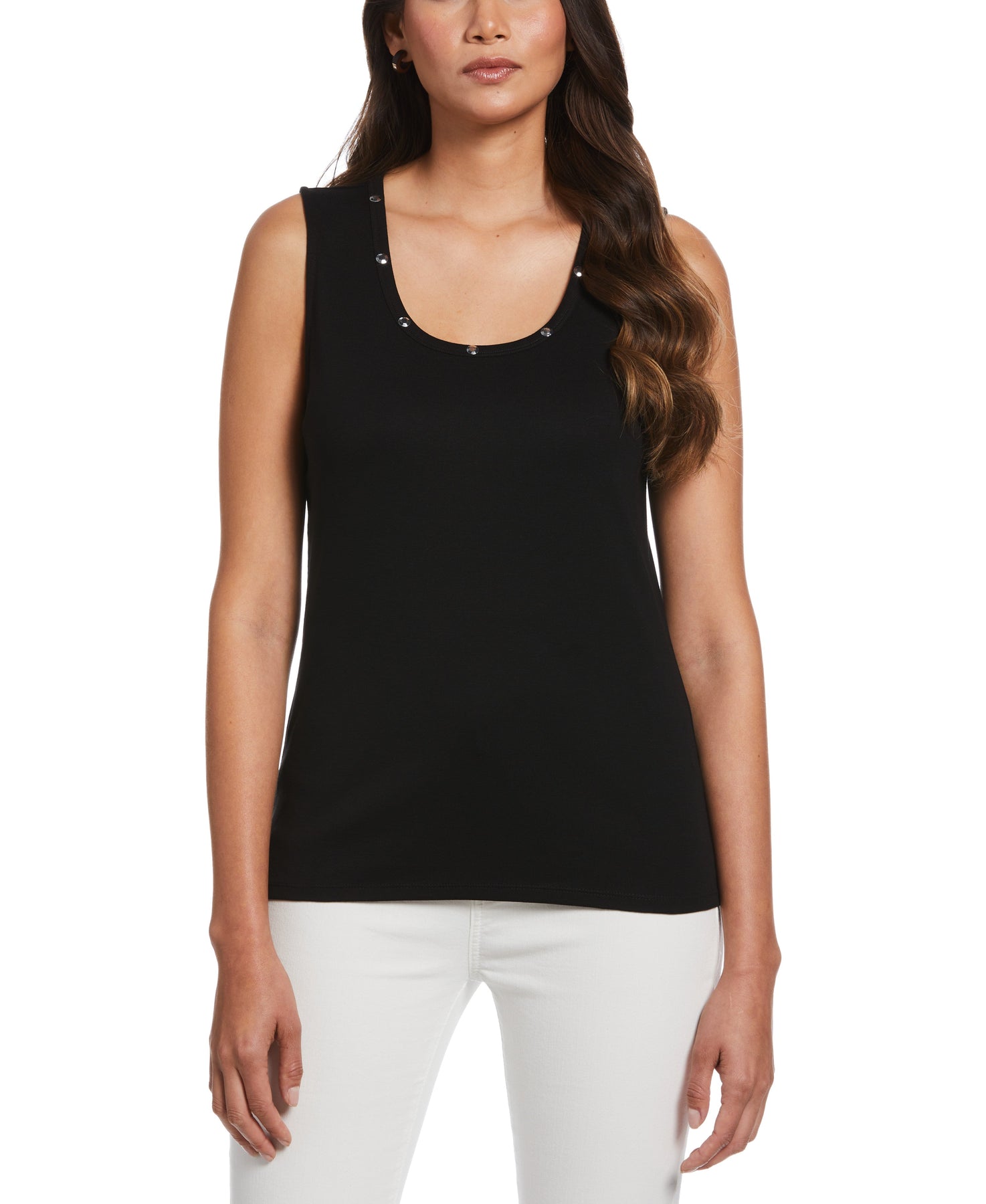 Silver-toned studs along the front neckline add some subtle edge to this versatile women’s tank top from Rafaella. Ideal for layering under a cardigan at the workplace or dining out with friends, this ladies’ top has a comfortable classic fit. The women’s sleeveless top is crafted from a ribbed fabric for a textured look and has a hint of flattering stretch.