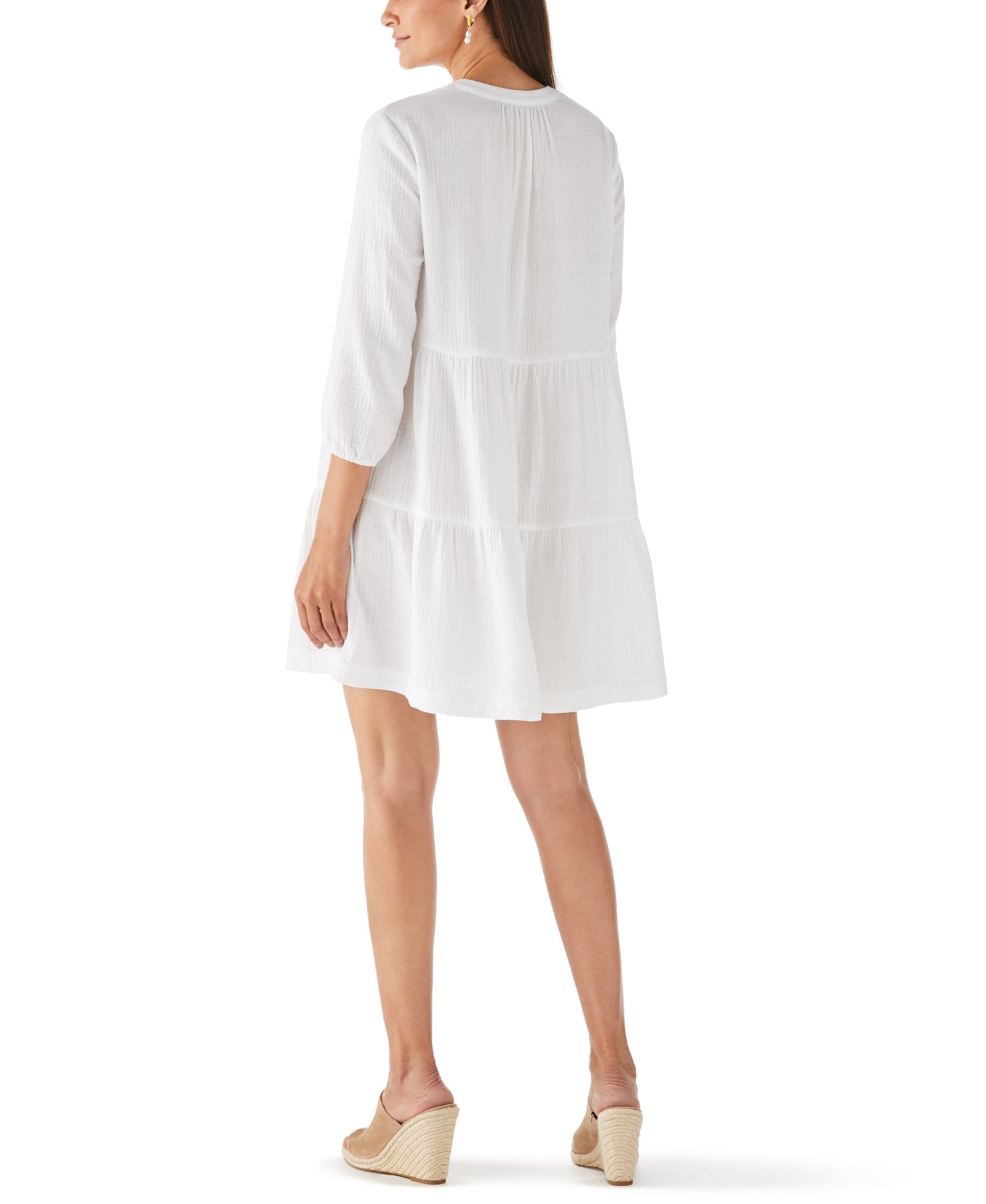 Enjoy strolling under clear blue skies in comfort and style with this casual dress from Ella. Gauze fabrication gives the material a light and airy feel perfect for sunny spring and summer weather. The women’s dress has a roomy yet flattering tiered design great for a relaxed weekend look. The ¾ sleeves feature elasticized cuffs, which hold them in place and help to create a stylish silhouette.